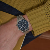 This 39mm watch is housed in stainless steel with a double-security folding clasp and a striking blue dial.