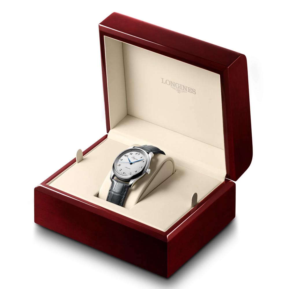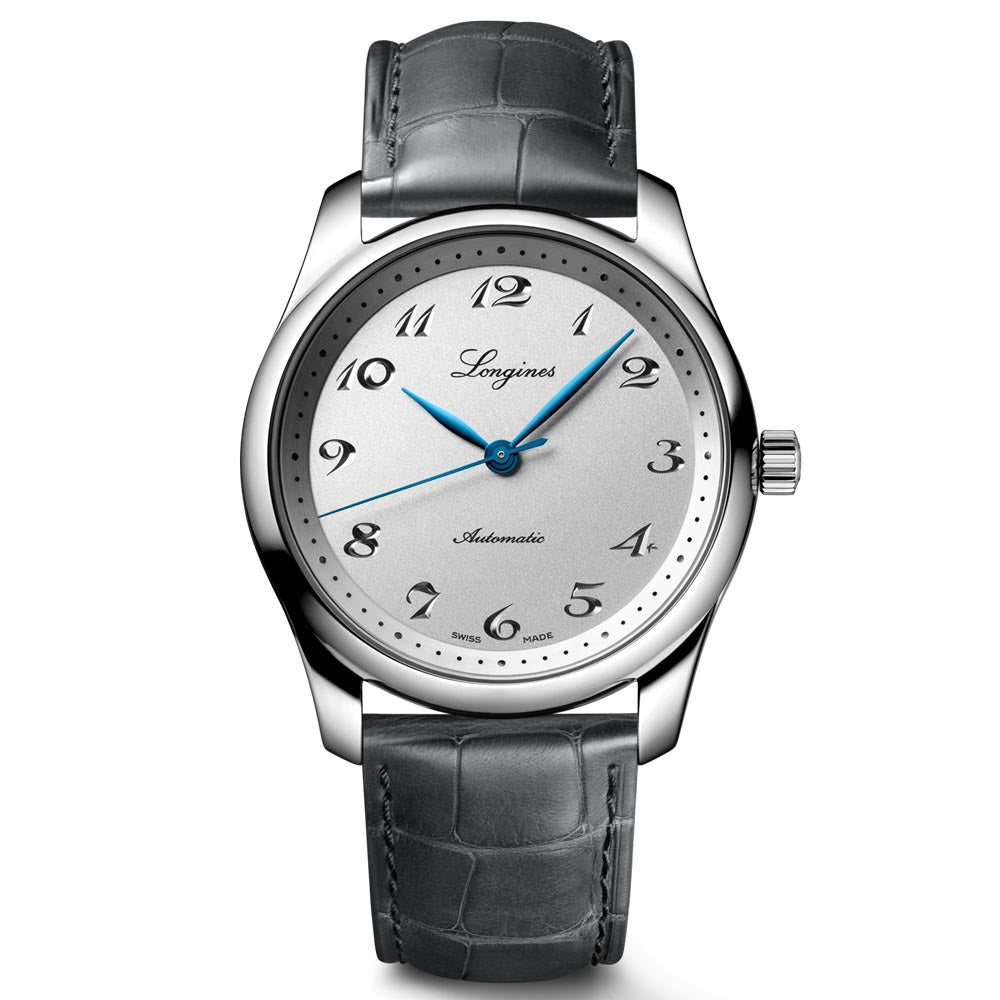 To commemorate their 190th anniversary, Longines have produced the impressive Longines Master Collection, boasting sandblasted silver dials with engraved Arabic numerals, blued steel hands, and a 40mm stainless steel case enclosing a specialized Longines movement and a silicon balance-spring, all visible through the transparent back adorned with a commemorative engraving. This exquisite watch is finished with a soft, anthracite grey leather strap.