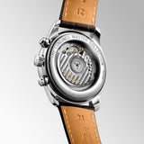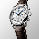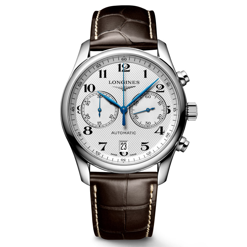 House in a 40mm polished case, its silver dial with painted numbers and a date window at the 6 o clock marker give a traditional and formal design. The Master collection is a piece of art featuring a full brown leather strap complete with deployment and an exhibition case to see the reliable Swiss made automatic movement in impeccable detail. Featuring two sub dials to count seconds and the chronograph minutes.