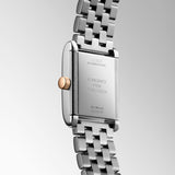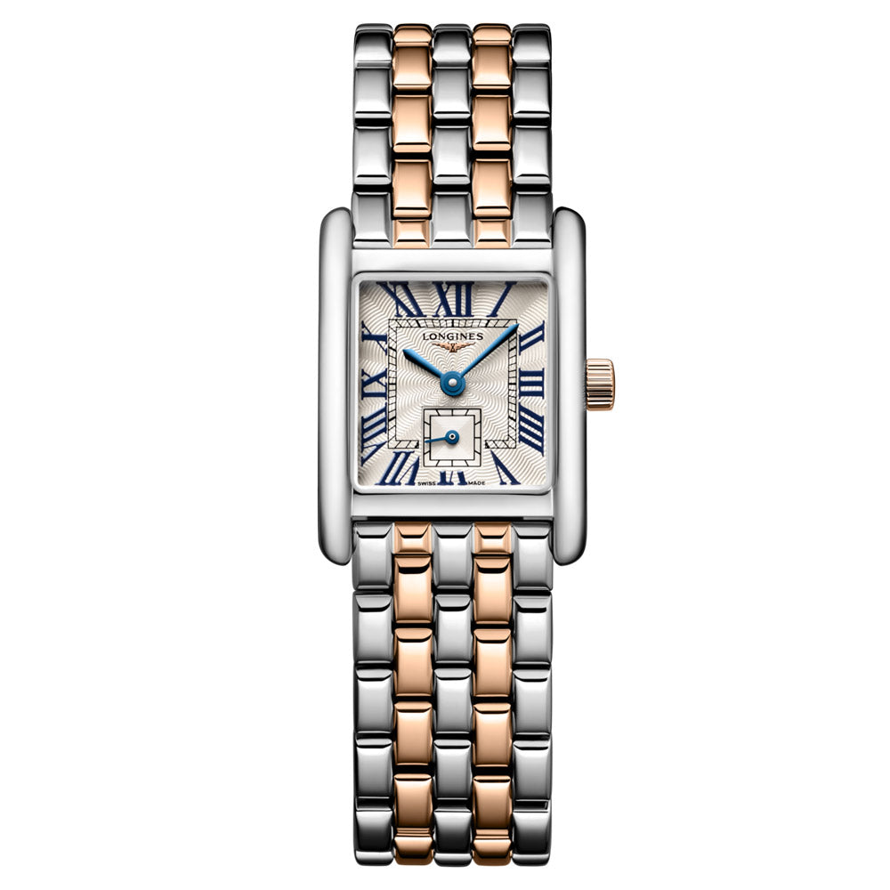 The Longines Mini DolceVita expresses a discreet yet timeless design that showcases the brand's refined luxury and contemporary sophistication. Drawing inspiration from a 1927 LONGINES icon, this meticulously crafted collection expands upon the original DolceVita family. Measuring 21.50mm x 29mm, the Mini DolceVita is available in a variety of materials and colors, including both diamond and non-diamond options.