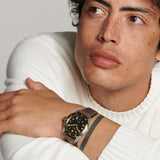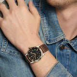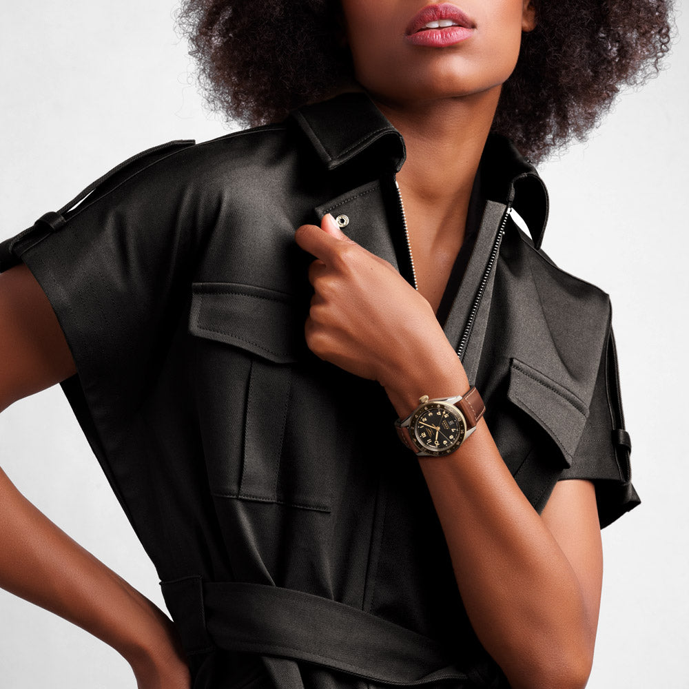 This 39mm steel case model boasts a bezel of 18ct gold capped with a chocolate brown ceramic insert, set against a sandblasted anthracite dial, with a date window at the 6 o'clock position. The interchangeable brown leather strap is fitted with a folding clasp and a micro-adjustment system for an ideal fit.