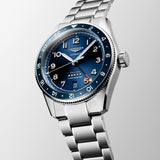 Featuring a bezel adorned with a blue ceramic insert, the 39mm steel case of the Longines Spirit Zulu Time GMT houses an interchangeable stainless steel bracelet. The sunray blue dial has a date window at its 6 o'clock position.