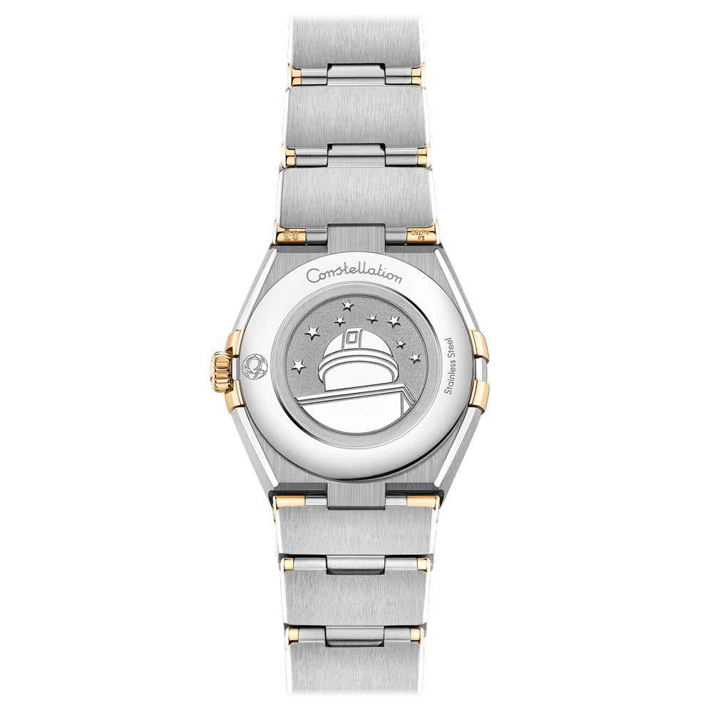 Crafted with an 18ct yellow gold and stainless steel combination, this 25mm diameter timepiece is detailed with a diamond-encrusted bezel and white mother-of-pearl dial with diamond hour markers. A scratch-resistant sapphire crystal and OMEGA Calibre 4061 provide accuracy, while the Constellation Observatory medallion adorns the caseback and the OMEGA logo, Constellation star, and diamond holders are crafted in 18ct yellow gold.