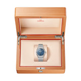 The dial is crafted from genuine iron meteorite and treated with a blue color, resulting in a one-of-a-kind pattern unique to each watch. A date window at 6 o'clock and 18ct white gold hands, indexes, and Constellation star complete the look.