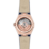 The OMEGA Constellation's iconic shape is defined by its half-moon facets and "claws." Featuring a beautiful natural blue Aventurine stone dial and a glistening matching-shade leather strap, this 29 mm model is crafted from 18ct Sedna™ gold, with a bezel adorned by Roman numerals and a date window at 6 o'clock. The hands, hour markers, OMEGA logo, and Constellation star are all crafted from 18ct Sedna™ gold. At the center lies the highly-accurate OMEGA Co-Axial Master Chronometer Calibre 8701, encased by a domed, scratch-resistant sapphire crystal.