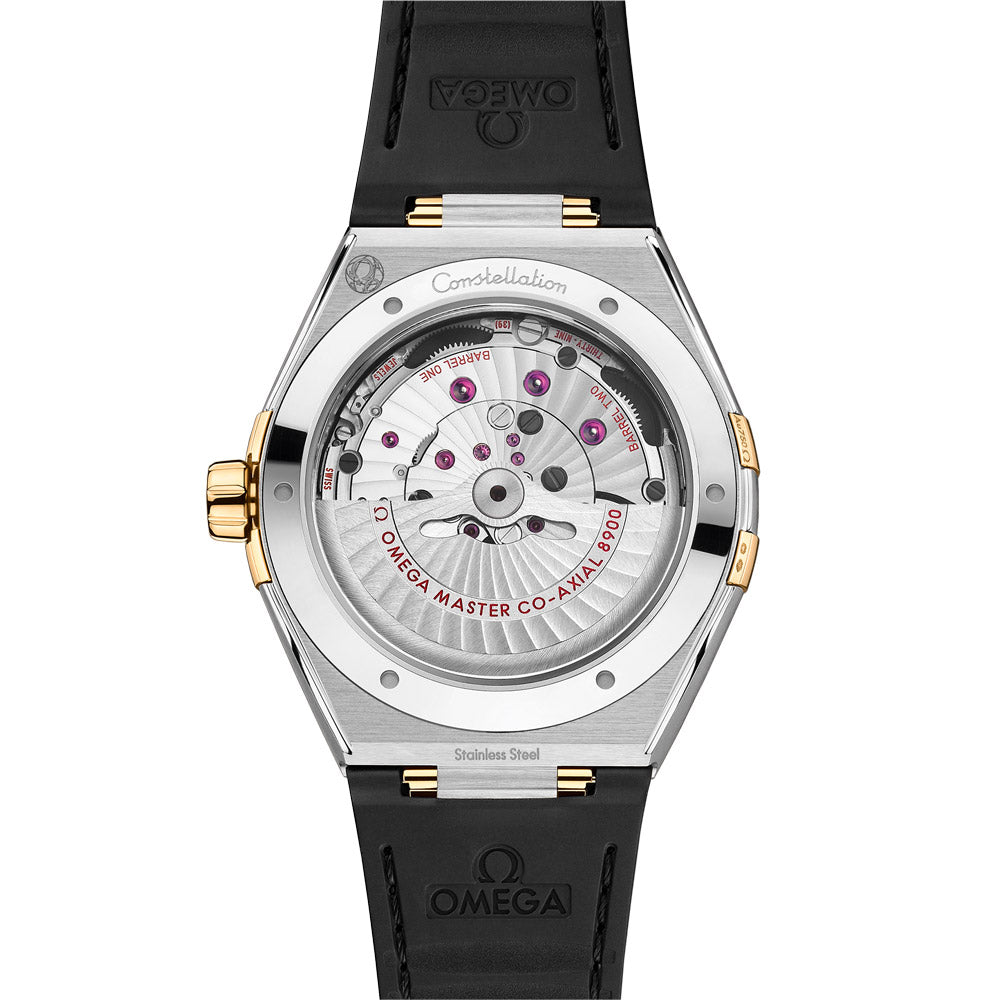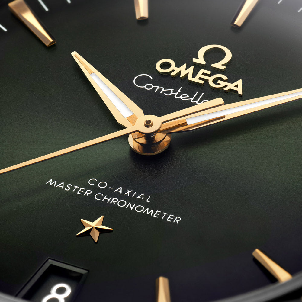 This 41 mm timepiece, with a blend of stainless steel and 18ct Yellow gold, incorporates a black polished ceramic bezel ring with Roman numerals inlaid with OMEGA Ceragold™. It offers a sun-brushed green dial with a gradient finish and has a date window at 6 o'clock. Its hands, OMEGA logo, Constellation star and indexes are all crafted from 18ct Yellow gold. This watch houses the OMEGA Co-Axial Master Chronometer Calibre 8900, viewed with clarity through the scratch-resistant sapphire crystal.