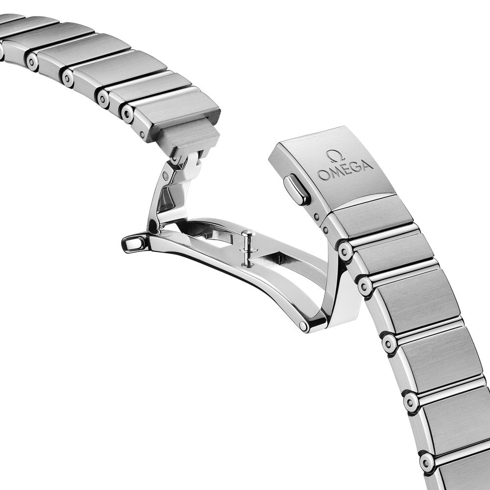 This stainless steel 25mm OMEGA Constellation is renowned for its half-moon domes, "claws" and mono-rang bracelet. Its bezel is etched with Roman numerals, while the dial is adorned with diamond hour markers, a white mother-of-pearl background and scratch-resistant saphire crystal. The hands, OMEGA logo, Constellation star and diamond holders are all crafted from 18ct white gold. This sophisticated watch is powered by the OMEGA Calibre 4061 and is stamped with the Constellation Observatory medallion on the rear.