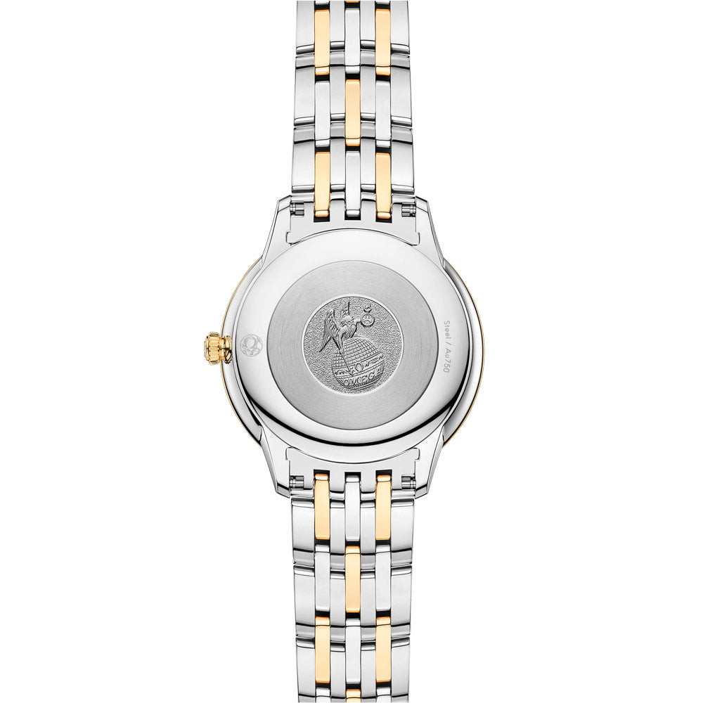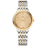 This 30mm stainless steel-18ct yellow gold OMEGA De Ville Prestige model has been a classic collection since 1994 & is now in its 3rd generation. Perfect for any lifestyle, it offers a range of patterns, finishes & colours. The Moonshine™ Gold dial is PVD coated & sun-brushed, with unique yellow gold-plated hands & Roman numerals/cabochon indexes. The minute track & embossed God Chronos medallion on the inner zone & caseback add a striking touch. This watch is powered by the OMEGA Quartz Calibre 4061 with a battery life of at least 48 months & comes on a stainless steel-yellow gold bracelet.