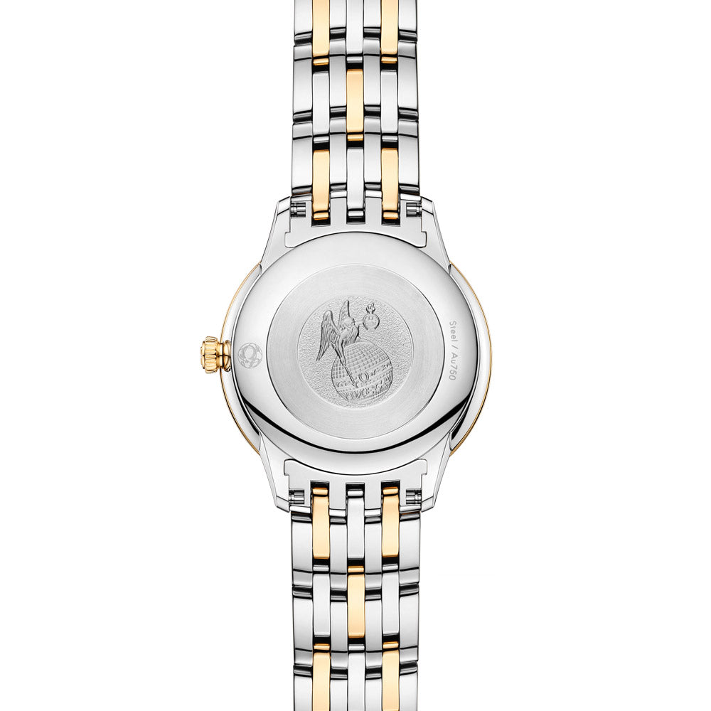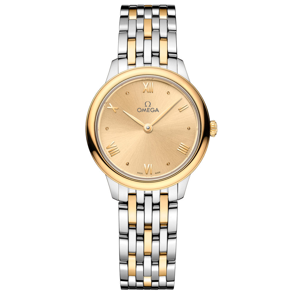 This 27.5mm stainless steel-18ct yellow gold OMEGA De Ville Prestige, part of a timeless collection since 1994, is now in its third generation. This watch features a distinctive PVD Moonshine™ Gold sun-brushed dial decorated with yellow gold-plated hands and alternating Roman numerals and cabochon indexes. The full caseback is adorned with a God Chronos Medallion, and the watch is presented on a stainless steel-yellow gold bracelet. Powered by the OMEGA Quartz Calibre 4061, this timepiece provides a battery life of 48 months or more.