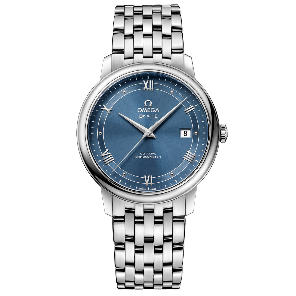 The OMEGA De Ville Prestige collection has been embraced by a devoted fan base for its tasteful, timeless look. These watches boast meticulous craftsmanship with luxurious finishes, and offer a classic design. This model includes a sun-brushed blue face bordered by a minute track, with a circularly brushed finish and polished cabochons. The scratch-resistant sapphire crystal shields the eye-catching dial, featuring a date window at 3 o'clock, and the 39.5mm stainless steel case is fitted with an elegant Prestige bracelet. Its precision is ensured by the Co-Axial calibre 2500.