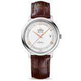 The OMEGA De Ville Prestige watch collection has gained a devoted following among admirers of its classic, luxurious design. Deliberately timeless, this timepiece is distinguished by sophisticated finishes and polished cabochons. The sun-brushed silver opaline dial is adorned with red gold-coloured Roman numerals and a date window at 3 o'clock, shielded by a scratch-resistant sapphire crystal. The 39.5 mm stainless steel case is paired with a brown leather strap, housing a Co-Axial calibre 2500.
