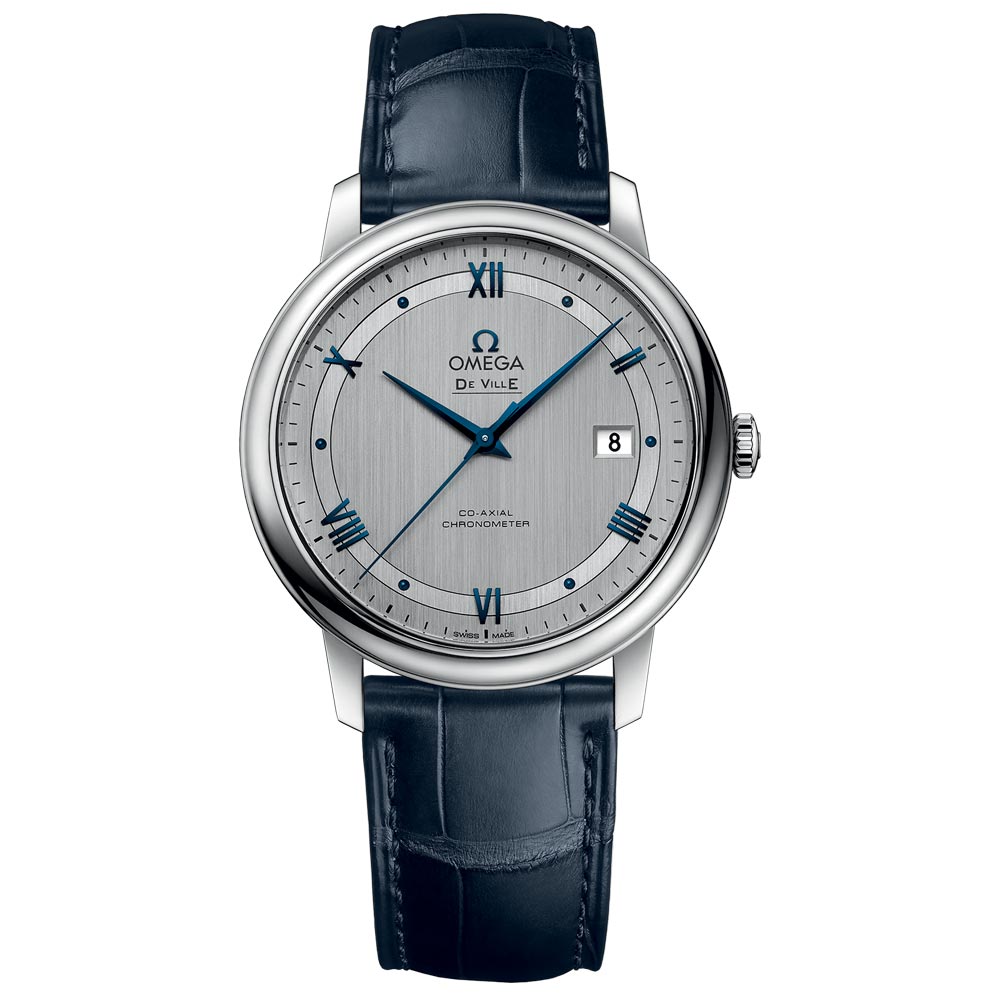 The OMEGA De Ville Prestige collection has earned a devoted following due to its classic, elegant design. An exemplary representation of this style, this model features a rhodium-silvery dial with polished Roman numerals, cabochons, and blued elements, as well as a date window at 3 o'clock, all under a scratch-resistant sapphire crystal. The 39.5mm stainless steel case is mounted on a striking blue leather strap, and is powered by the esteemed Co-Axial calibre 2500.