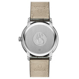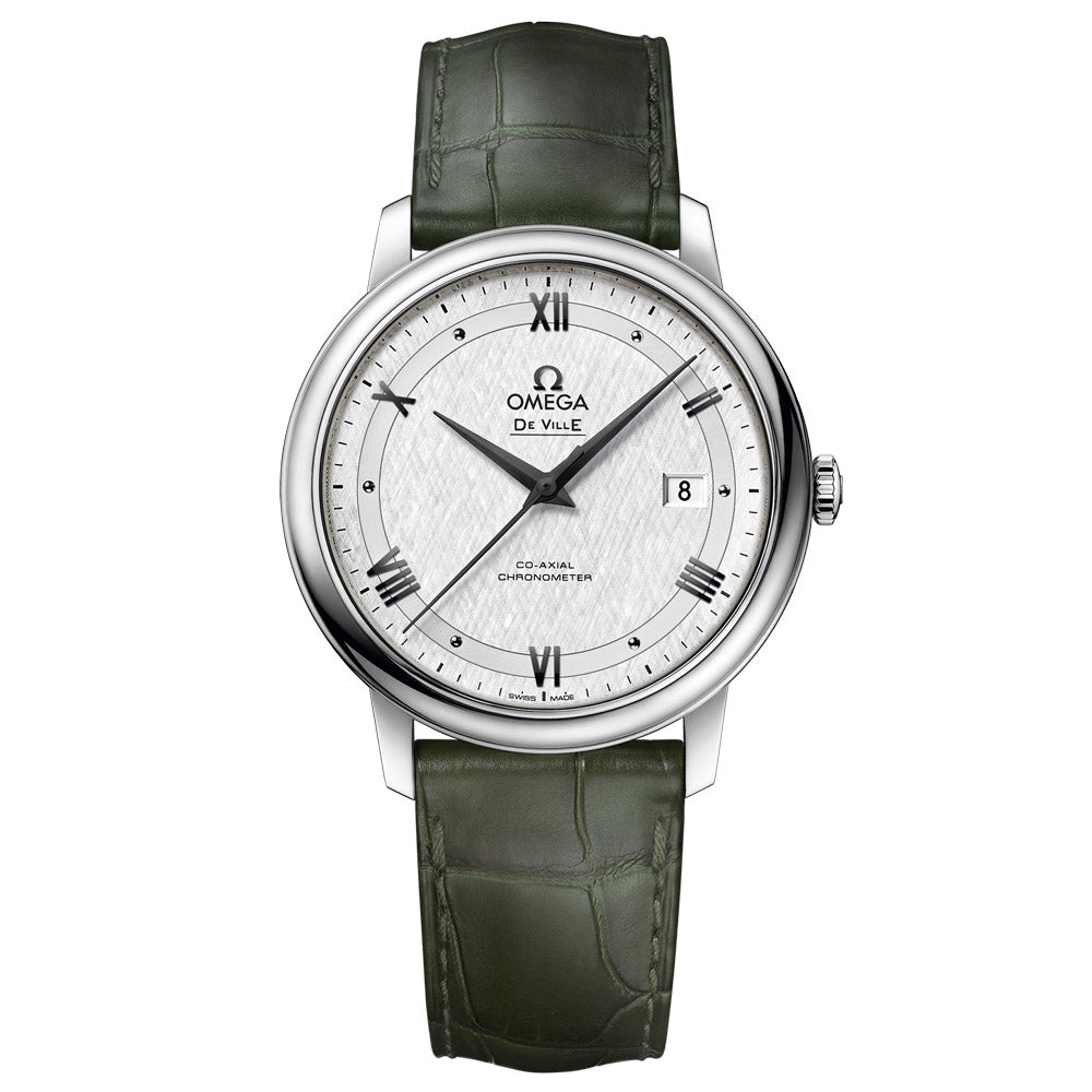 The OMEGA De Ville Prestige series is celebrated for its classic, elegant styling and luxurious finishes. This particular model is adorned with a white silvery dial with a silk-like pattern and opaline finish, blackened hands and hour-markers (including 6 blackened cabochons and blackened Roman numerals), as well as a date window at 3 o'clock. The 39.5 mm stainless steel case is presented on a hunter green leather bracelet and is equipped with the Co-Axial Calibre 2500 movement.