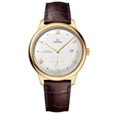 The classic OMEGA De Ville Prestige has enjoyed immense popularity since its launch in 1994. This 18ct yellow gold 41mm watch is a modern representation of timeless elegance, featuring a domed silvery dial and yellow gold-plated hands. The display is distinguished by alternating Roman numerals and cabochon indexes, plus a date window and small-seconds subdial. The timepiece is complete with a railway minute track and presented on a brown leather strap. Internally, this Master Chronometer certified watch is powered by the OMEGA Master Co-Axial Calibre 8802, visible through its scratch-resistant sapphire crystal caseback.