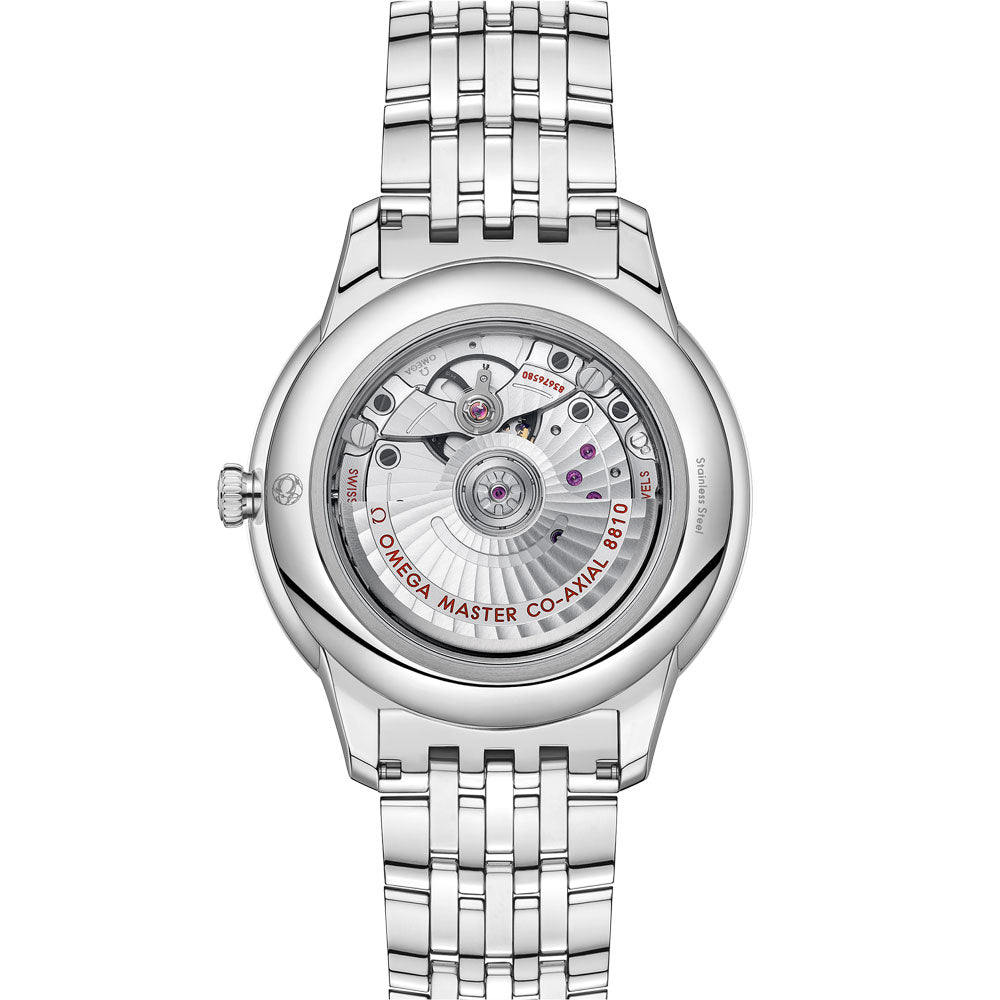 The OMEGA De Ville Prestige range, epitomising classic design since 1994, has now reached its third generation. This 41mm stainless steel model features a PVD light blue dial, graced with a stamped random vertical pattern in a sun-brushed finish, rhodium-plated hands, Roman numerals and cabochon indexes. Notable accents include the 270° power reserve indication at 6 o’clock, characterised by 4 sectorial cut-throughs in crescent shape, and date window, small-seconds subdial and railway minute track on the outer zone. The timepiece is powered by a Master Co-Axial Calibre 8810, viewable through the sapphire crystal caseback. Certified as a Master Chronometer, the watch is presented on a stainless steel bracelet.