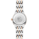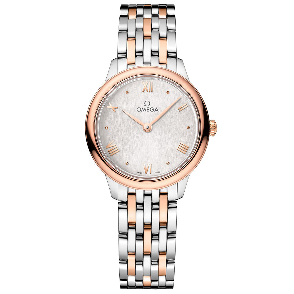 The iconic OMEGA De Ville Prestige has been a staple of fine watchmaking since 1994, captivating audiences with its classic designs and exquisite elegance. This 27.5 mm stainless steel - 18ct Sedna™ Gold timepiece showcases a silver dial with a stamped random vertical pattern in a sun-brushed finish, with PVD Sedna™ Gold-toned hands and alternating Roman numerals and cabochon indexes completed by a full caseback featuring a god Chronos medallion. This watch, powered by the OMEGA Quartz Calibre 4061 with a battery life of 48 months, is presented on a stainless steel - Sedna™ Gold bracelet.