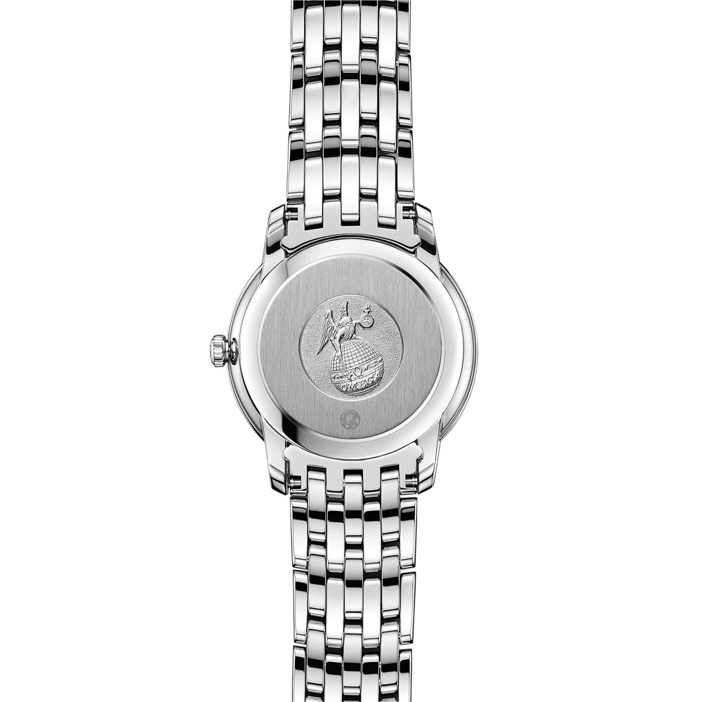 The OMEGA De Ville Prestige selection has garnered a devoted clientele thanks to its classic, sophisticated look. Characterized by simple styling with luxurious finishes, this model boasts a white silvery dial with silken pattern and opaline coating. Hands and hour-markers are treated in black, including six diamond holders and Roman numerals. The 27.4mm stainless steel case is showcased on a polished stainless steel Prestige bracelet, driven by OMEGA Calibre 1376.