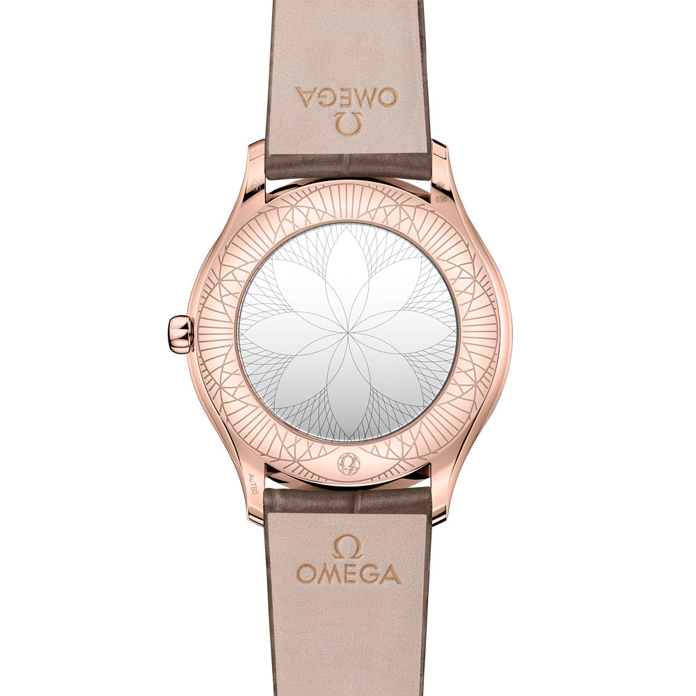 This contemporary collection of watches from OMEGA reflects the brand's long tradition of crafting beautiful watches for women. The slim 36mm case is made from 18ct Sedna™ gold and studded with diamond paving along each side, with a polishing of red "HyCeram" and an embedded single diamond at the crown. The lacquered taupe-brown dial features embossed 18ct Sedna™ gold Roman numerals, and the hands are set in the same type of gold. Powering the timepiece is the OMEGA calibre 4061, housed within a mirrored caseback with the “Her Time” pattern. Completing the look is a taupe-brown leather strap.