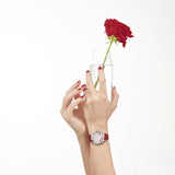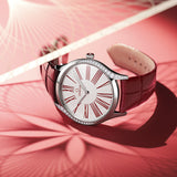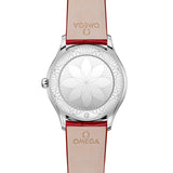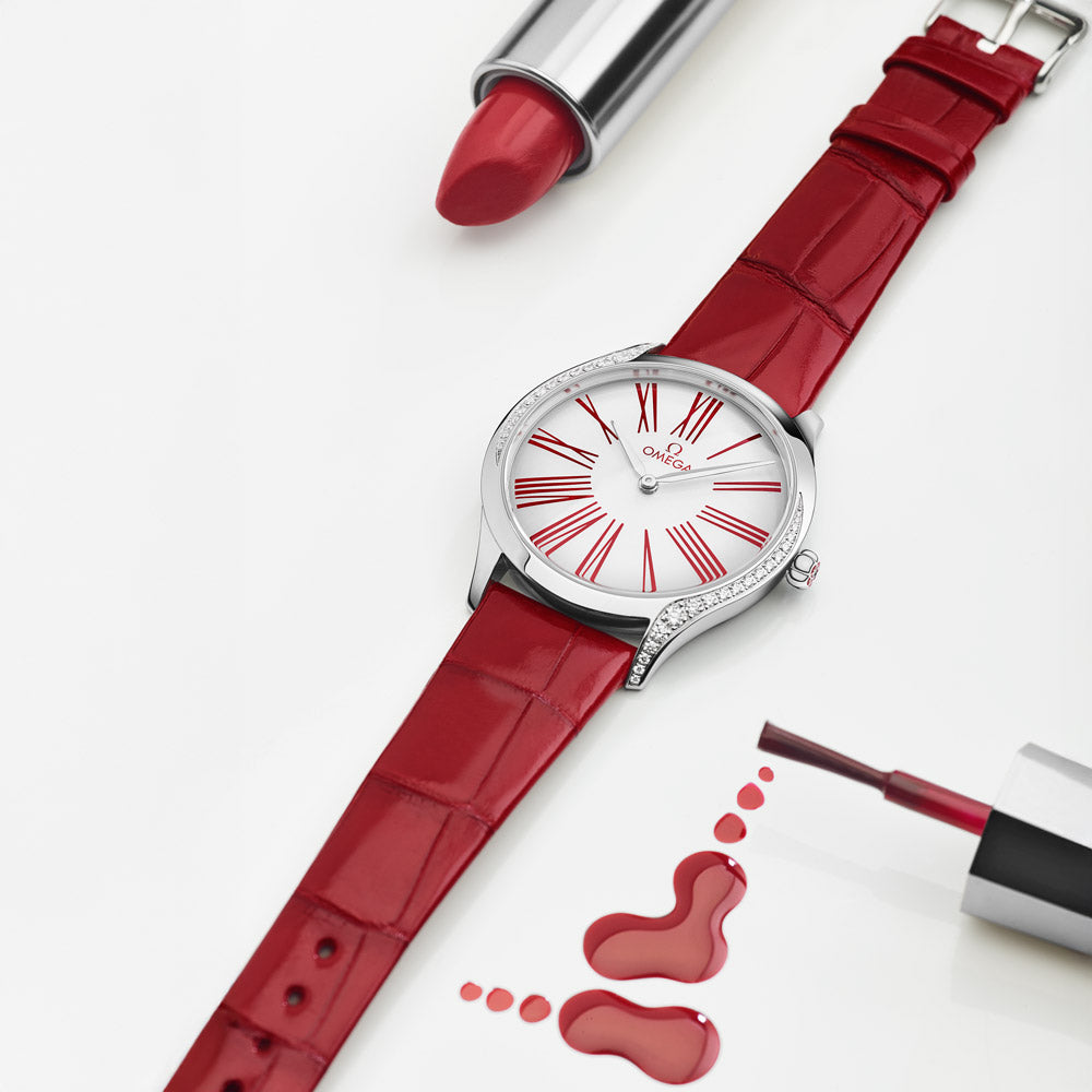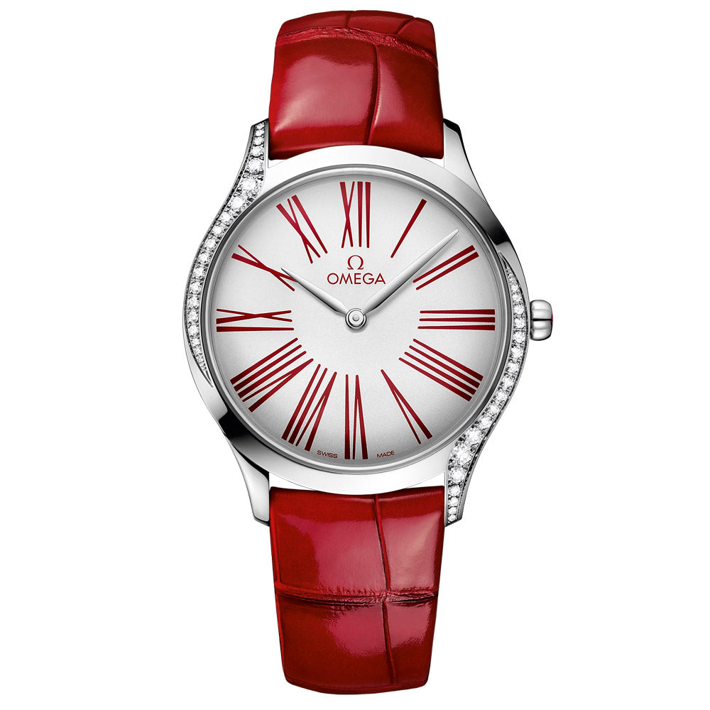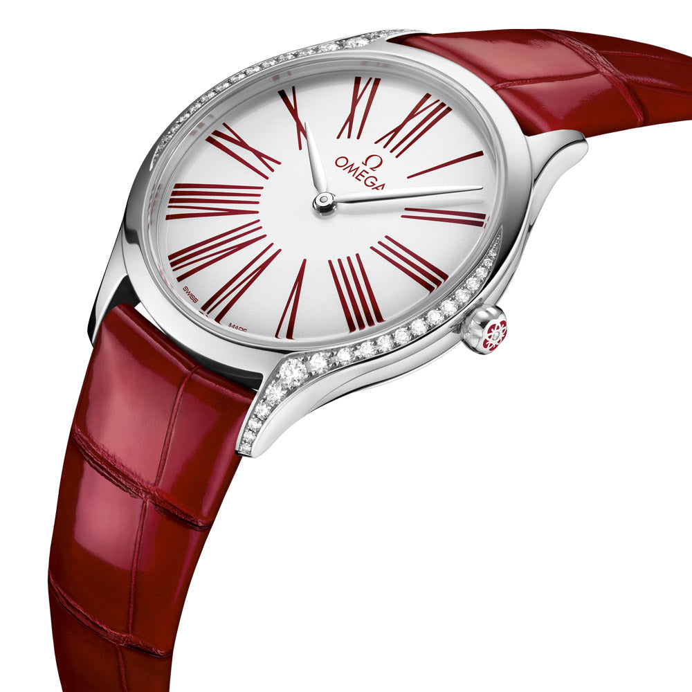 OMEGA has a well-established place in the watchmaking industry for providing stylish designs for women. The latest Trésor collection showcases the brand's modern aesthetic. This particular model is built from stainless steel and complemented by 38 single-cut diamonds on its slim 36mm case. The dial is lacquered white and marked with red Roman numerals, with a single diamond embedded into the crown at the centre. Topped with a red leather strap, the timepiece is powered by the OMEGA Calibre 4061 and finished with a polished mirror caseback featuring a metalized "Her Time" design.