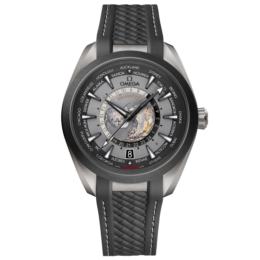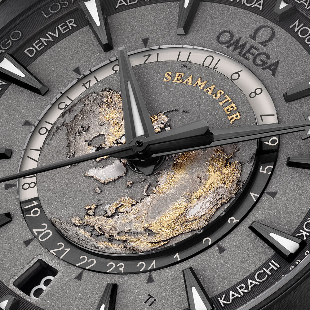 At the heart of the black and grey dial, bordered by a brushed black ceramic bezel, OMEGA presents a depiction of Earth seen from above the North Pole, created by laser-ablation of continents and colour on a grade 5 titanium surface. Encircling the topographical map is a 24-hour display, separated into night and day sections.
