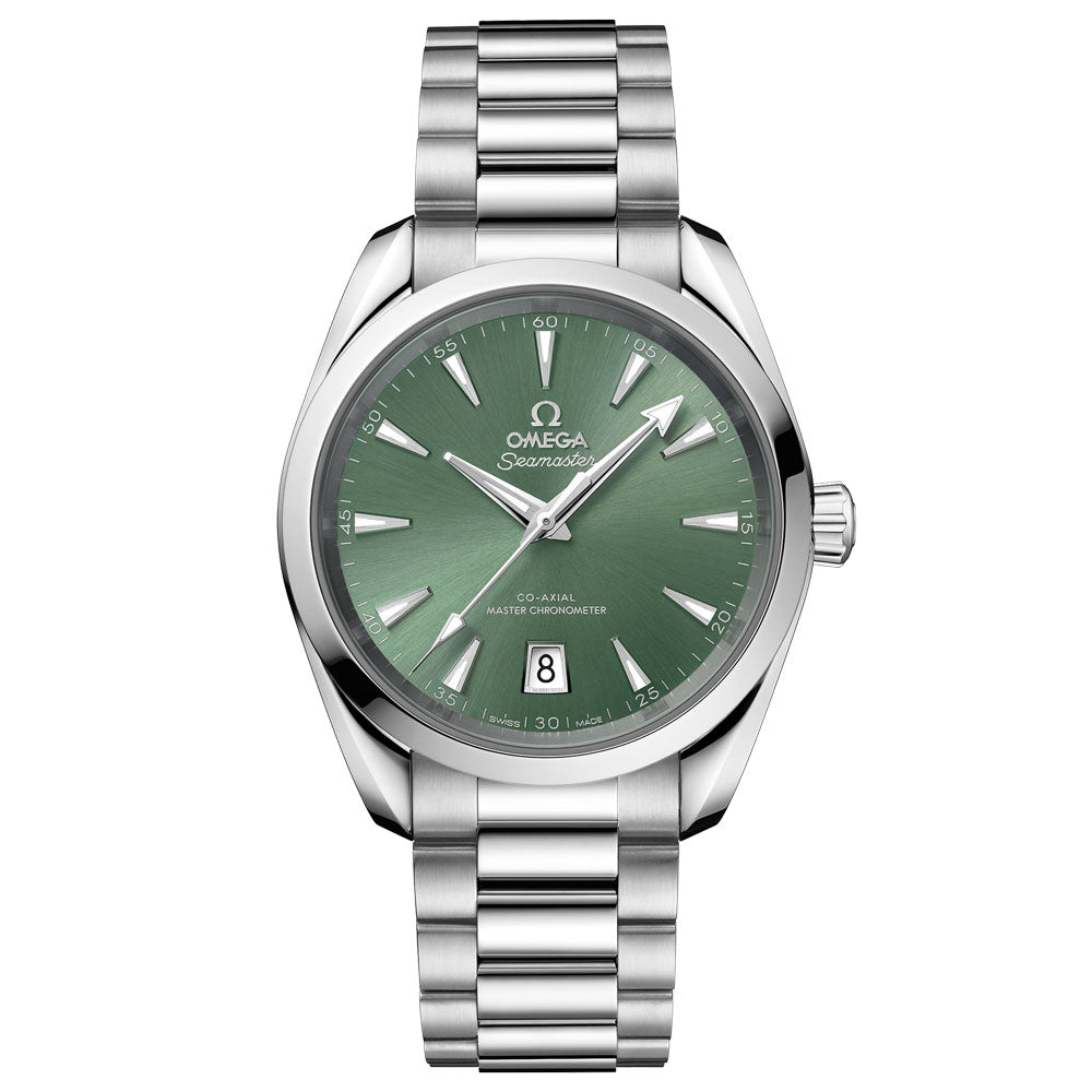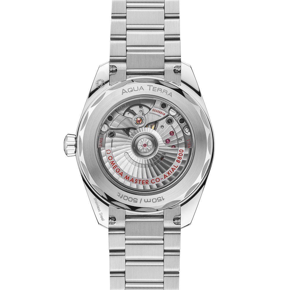 The OMEGA Seamaster Aqua Terra Shades 38mm Bay Green Dial Automatic Watch 22010382010002 is a perfect homage to the brand's extensive history in the marine industry. This precisely crafted timepiece boasts a 38mm symmetrical case and a polished stainless steel crown, adorned with a distinctive wave design on the reverse side.