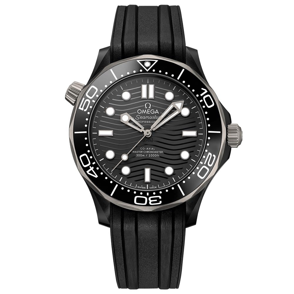 The timepiece is presented on a black integrated rubber strap, paired with a polished-brushed black ceramic [ZrO2] buckle for a secure fit. Inside the wave-edged caseback is the OMEGA Master Chronometer Calibre 8806, revealed through the sapphire-crystal window.