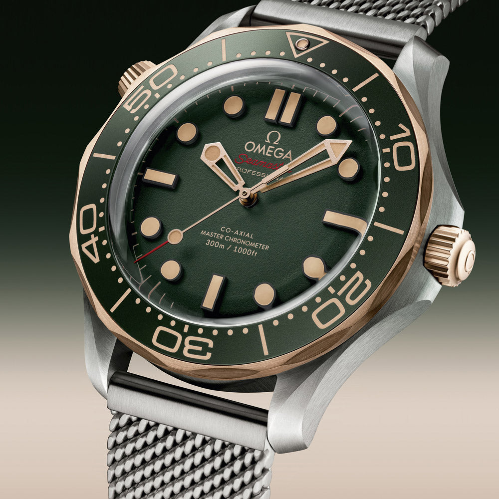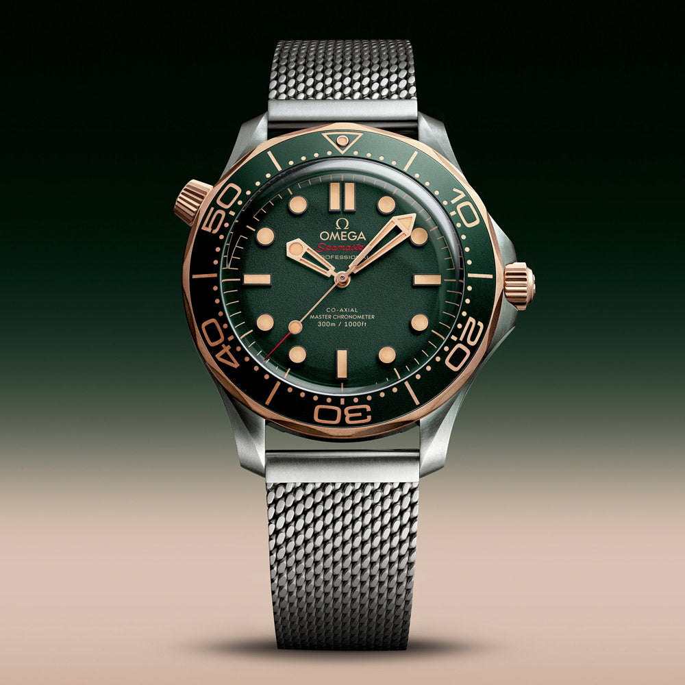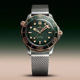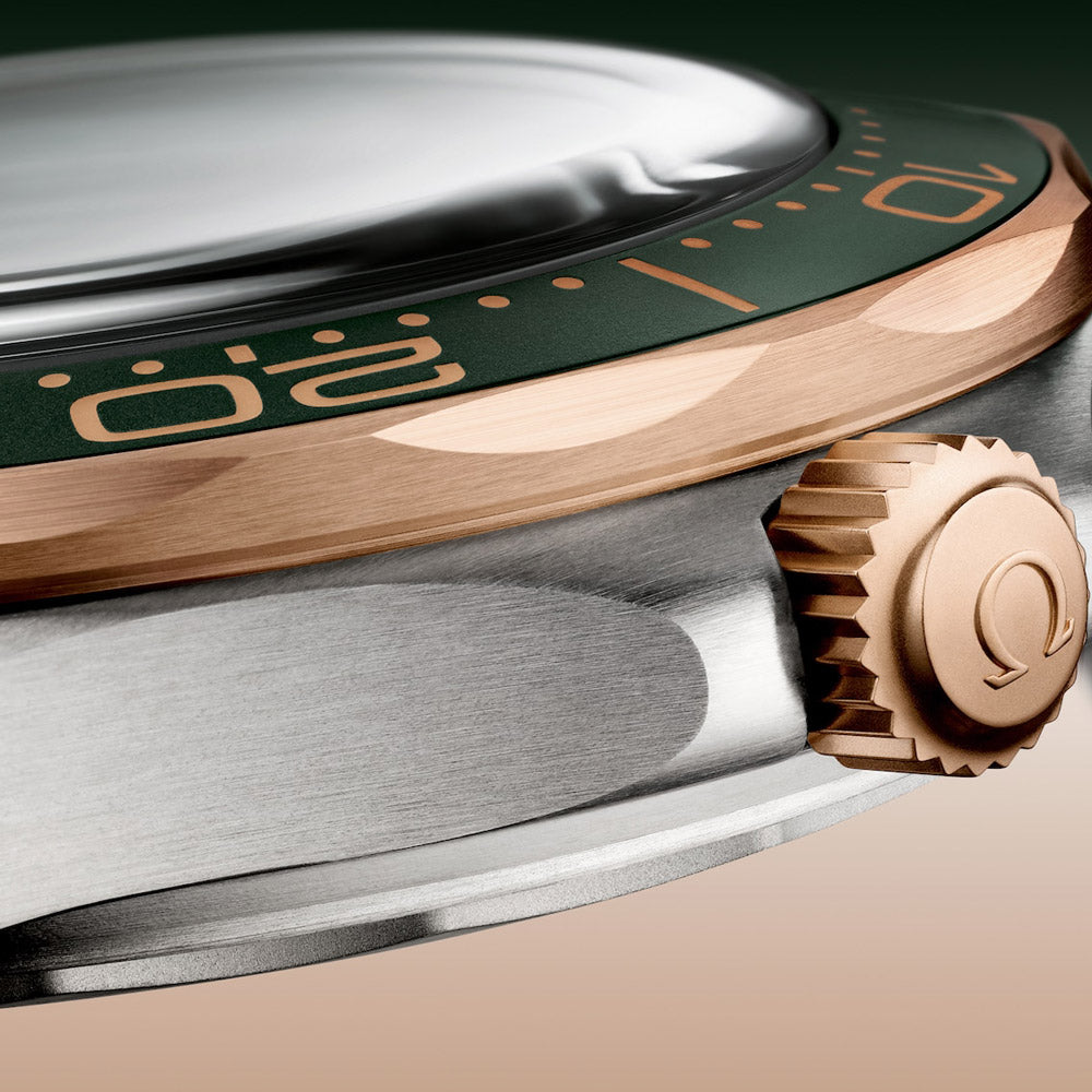 Crafted with OMEGA's exclusive 9K Bronze Gold and grade 2 titanium, this 42 mm model features a green oxalic anodized aluminium bezel ring with a diving scale in vintage Super-LumiNova.