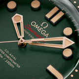 This watch's dial is made from sandblasted green aluminium and is adorned with PVD 18ct Bronze Gold hands and blackened indexes. Both the OMEGA logo and other markings, including the hands, feature vintage Super-LumiNova in light brown and red for a unique look.
