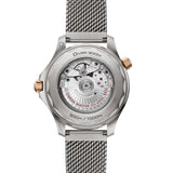 This watch features a brushed mesh bracelet with clasp and is powered by the OMEGA Co-Axial Master Chronometer Calibre 8806, visible through the sapphire-crystal and wave-edged caseback.