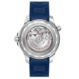 This timepiece is showcased on a blue rubber band and boasts OMEGA's Master Chronometer Calibre 8800 that can be viewed through the scalloped caseback's sapphire crystal.