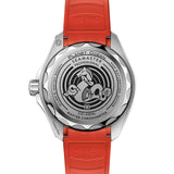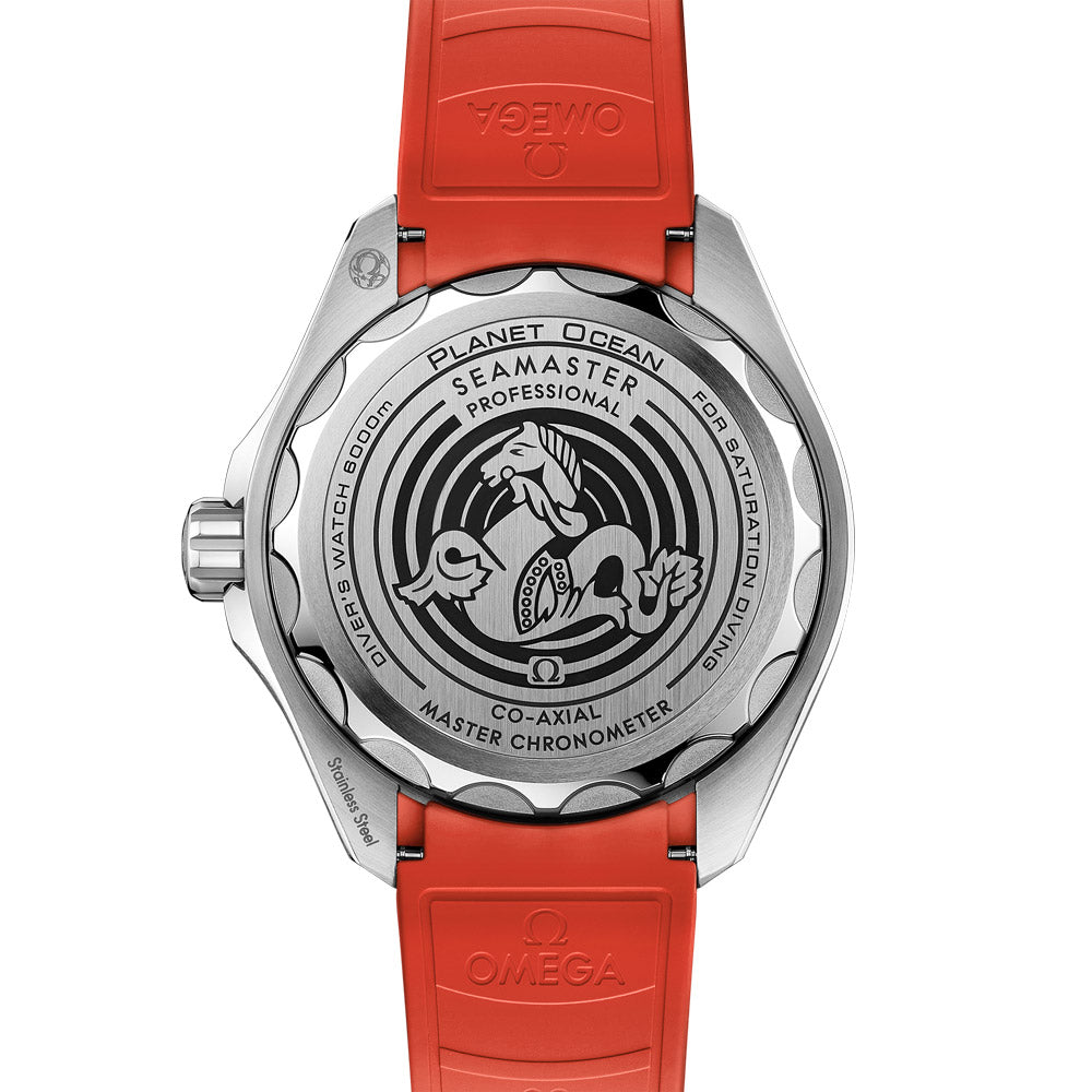 The watch features a rubber strap with orange lining and an O-MEGASTEEL buckle, and the Grade 5 titanium medallion on the caseback showcases a laser-engraved Sonar emblem with the iconic OMEGA Seahorse. Powering the watch is the OMEGA Co-Axial Master Chronometer Calibre 8912.