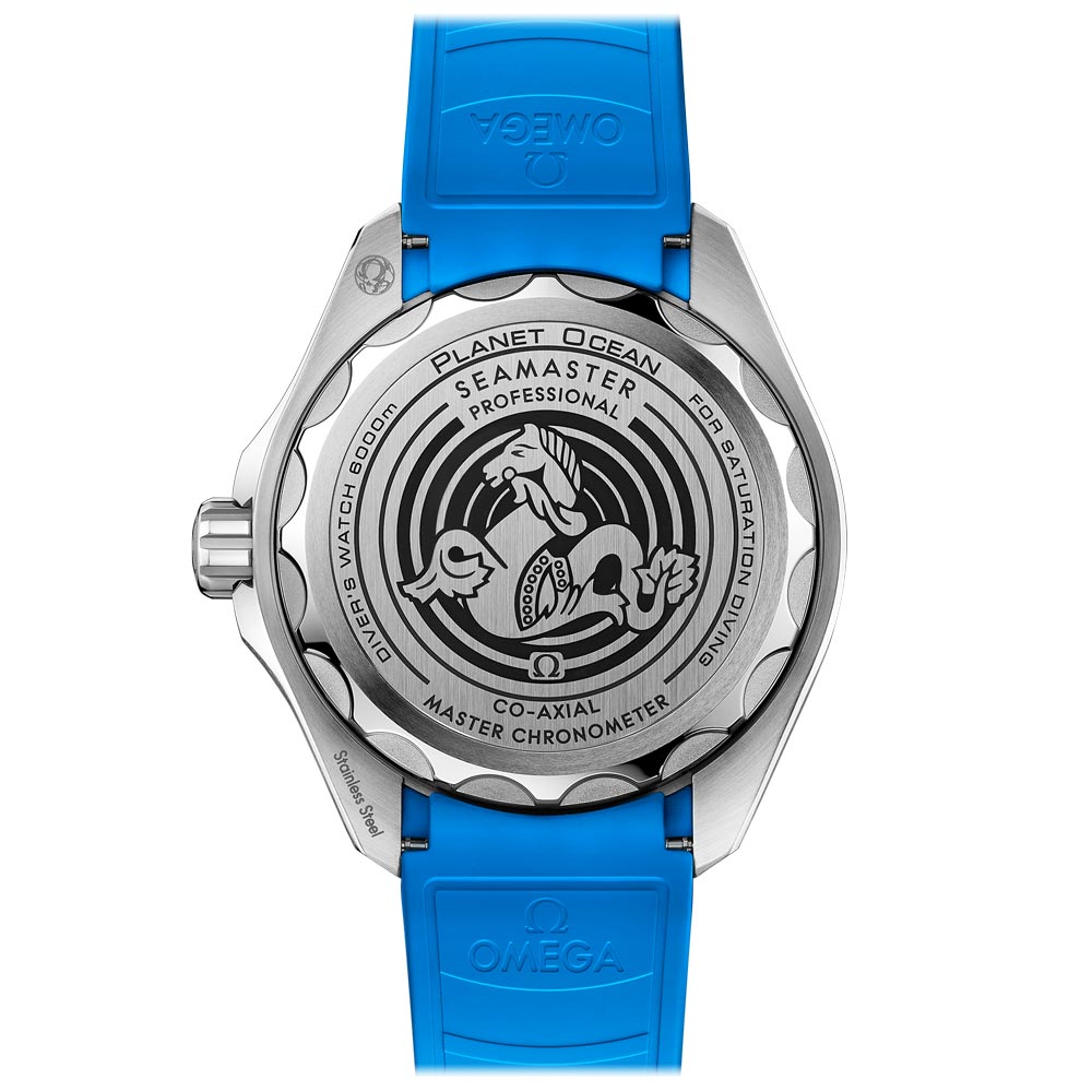 The timepiece is presented on a rubber strap with a cyan lining and O-MEGASTEEL buckle, and the Grade 5 titanium medallion on the caseback features a laser-engraved Sonar emblem with OMEGA's iconic Seahorse at its center. Achieving power within is the OMEGA Co-Axial Master Chronometer Calibre 8912.