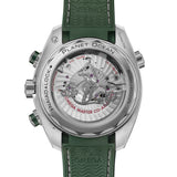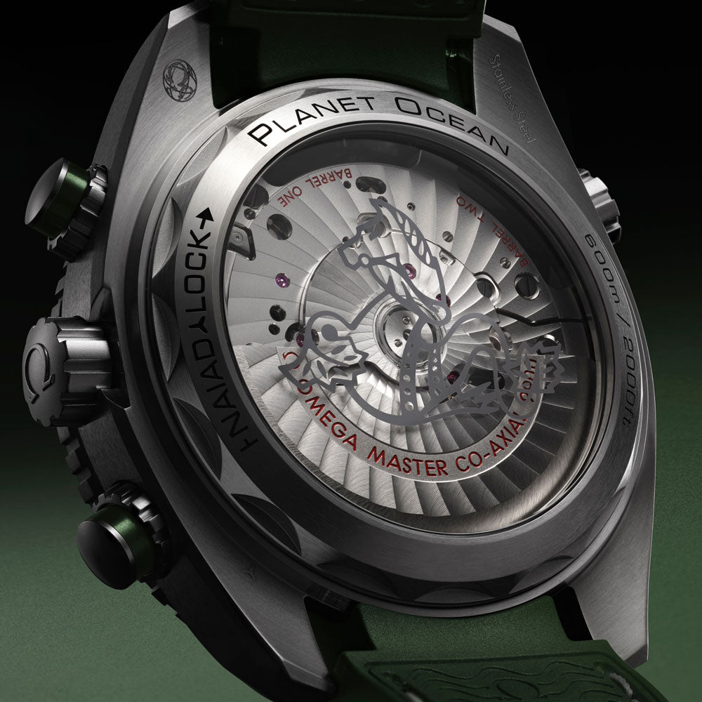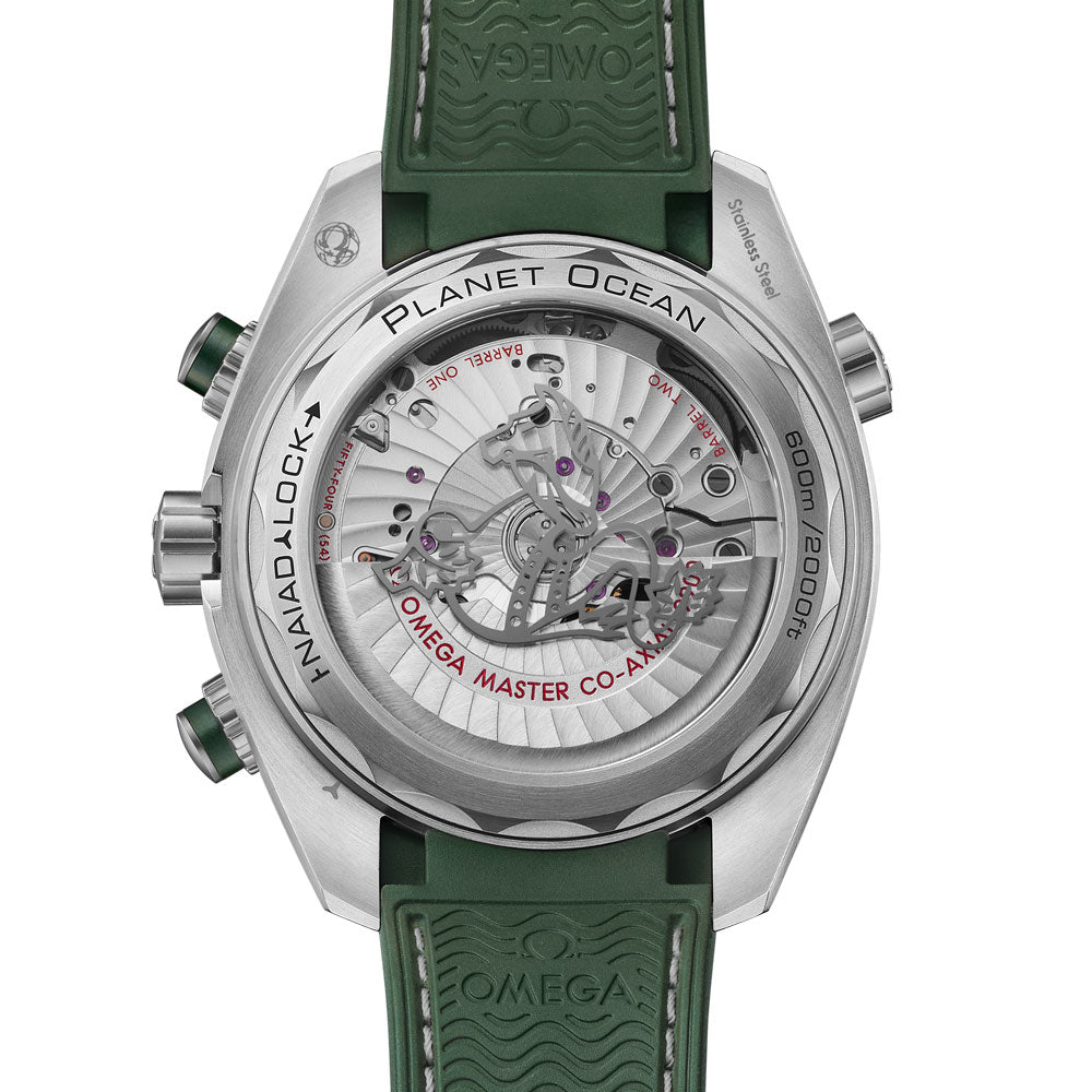 Equipped with the Co-Axial Master Chronometer Calibre 9900, this Seamaster Planet Ocean features an integrated green rubber strap with a structured pattern and light grey and green stitching. The NAIAD LOCK caseback is adorned with a metallized seahorse on the sapphire crystal.