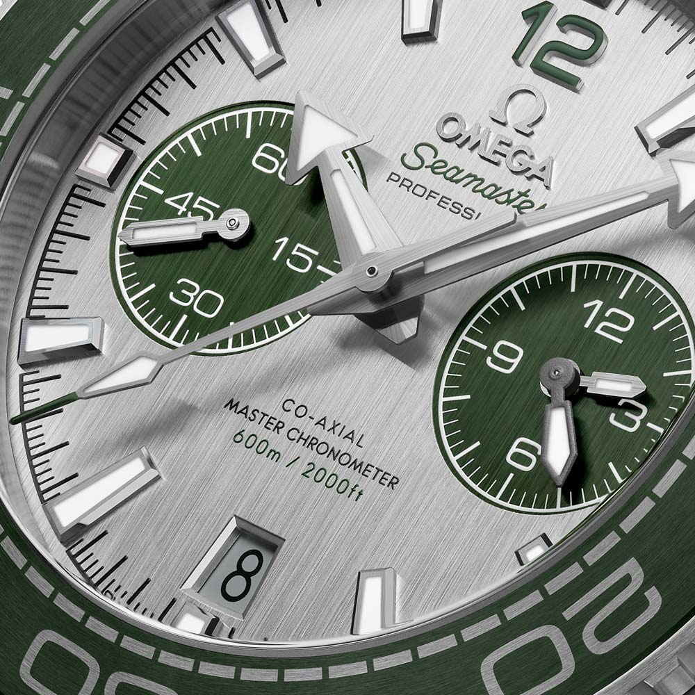 The dial is made of brushed stainless steel and features a 6 o’clock date window, green ceramic subdials, a varnished green number 12, and green and black transferred words. The PVD stainless steel OMEGA logo, hands, and hour markers have a brushed finish, and the white Super-LumiNova enhances visibility in low light environments.