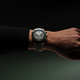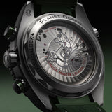 Crafted from brushed stainless steel, the 45.50 mm case of this chronograph model boasts brushed green ceramic pushers and a ceramic bezel ring with a diving scale in Liquidmetal™.