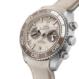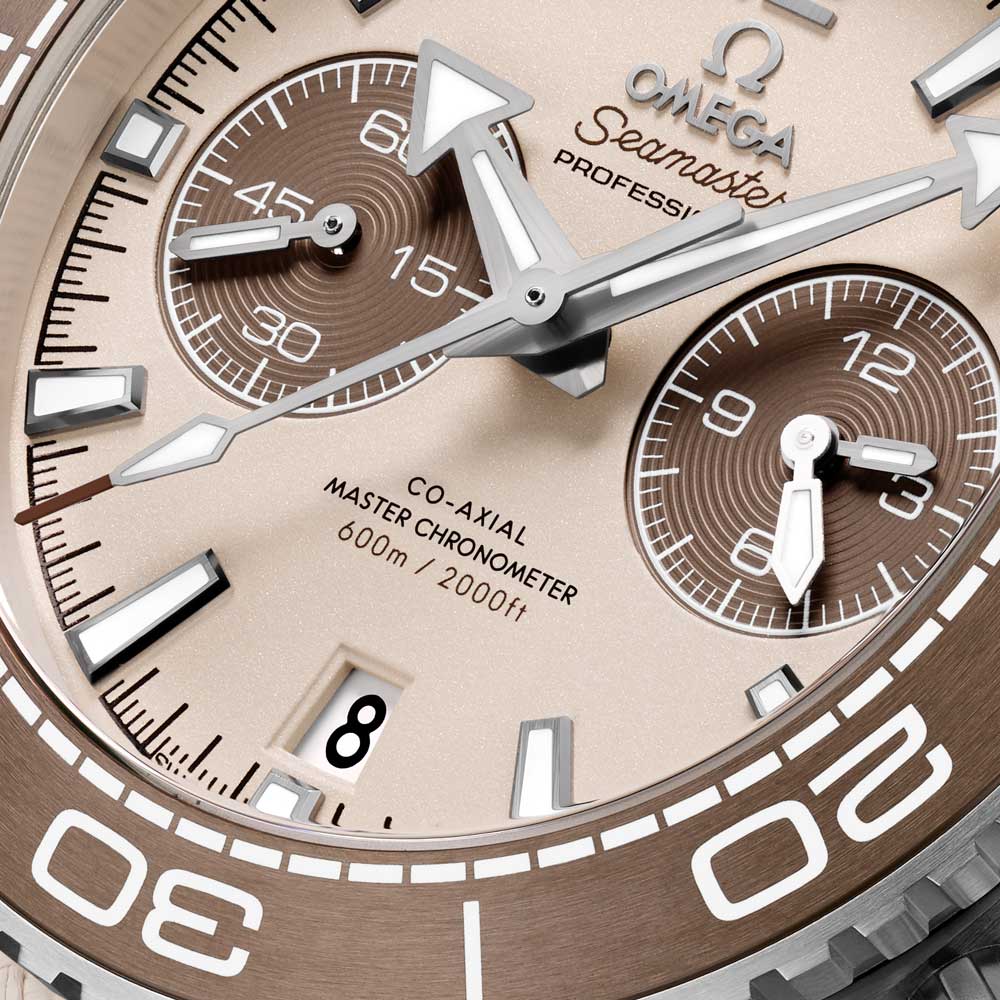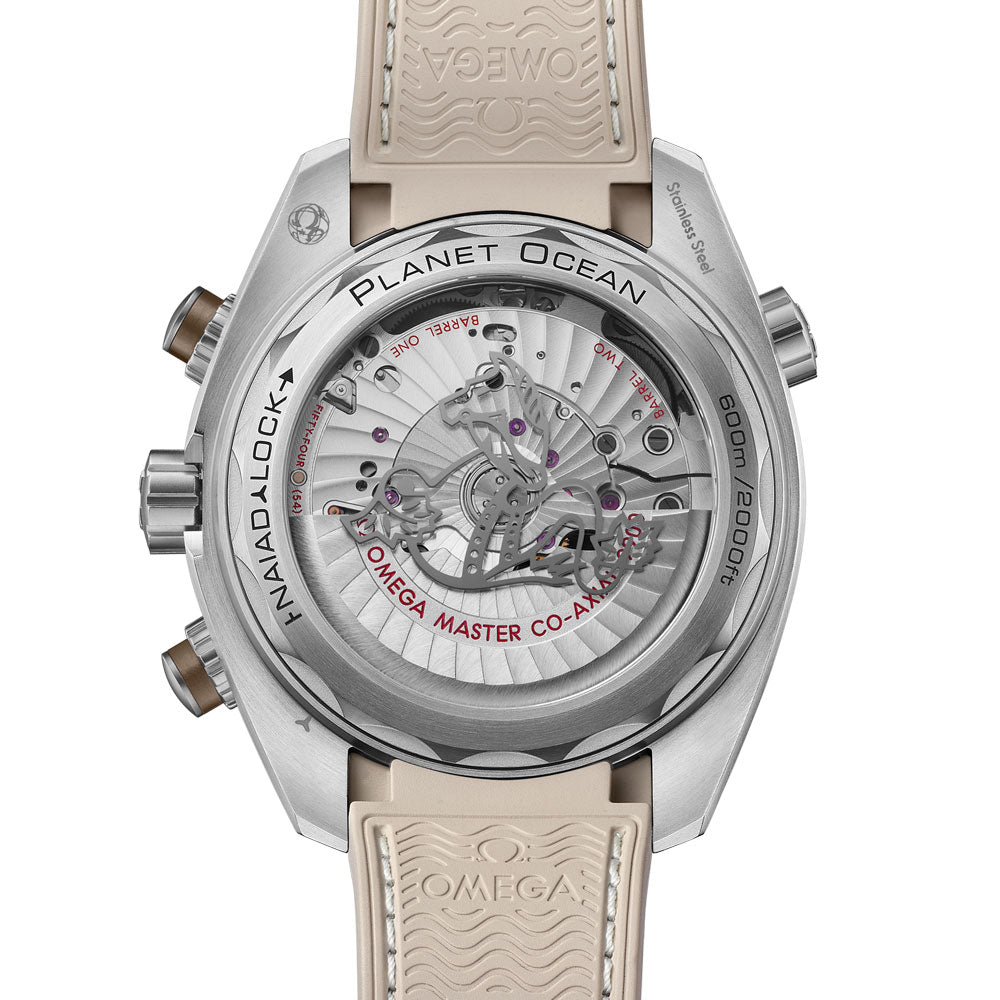This model of the OMEGA Seamaster Planet Ocean watch features a sand-blasted beige dial with a classic varnish. The dial also includes a date window at the 6 o’clock position, as well as "azure" bronze silicon nitride ceramic subdials. The transferred words are in brown and black, and the OMEGA logo, Arabic numerals, hands, and hour markers are all in a sophisticated PVD grey with a brushed finish. The white Super-LumiNova enhances visibility in low light conditions. This watch is powered by the Co-Axial Master Chronometer Calibre 9900 and is worn on an integrated beige rubber strap with a structured pattern and white stitching. The NAIAD LOCK caseback features a metallized seahorse on the sapphire crystal.