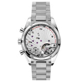 This 40.50 mm model, inspired by the 1957 version, is equipped with a stainless steel case and a green dial featuring rhodium-plated hour markers, "Broad Arrow" hands, and white Super-LumiNova. There's a date window at 6 o'clock, a small seconds subdial at 9 o'clock, and 12-hour and 60-minute chronograph recorders on the subdial at 3 o'clock. Featuring a blackened tachymeter scale, the brushed bezel adds an extra touch of detail. On the caseback, there's an inscribed "Speedmaster '57" and a flat sapphire crystal with an anti-reflective coating.