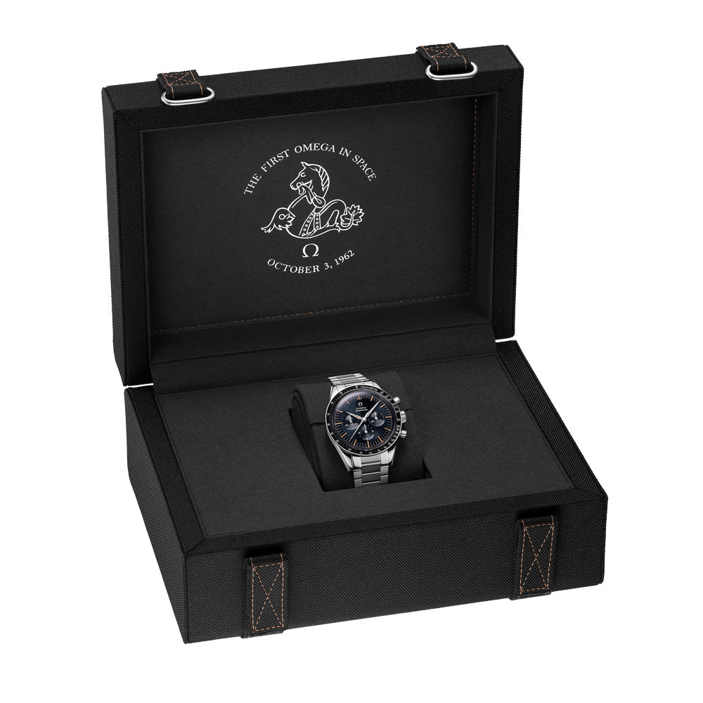 The watch's dial and crown showcase the classic OMEGA logo, with a caseback adorned with the iconic Seahorse medallion as well as engravings of "THE FIRST OMEGA IN SPACE" and "OCTOBER 3, 1962."