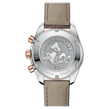 The timepiece features a taupe-brown leather strap, a Seahorse medallion on the reverse side, and is powered by the OMEGA Co-Axial Calibre 3330.