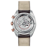 Measuring 44.25 mm, this timepiece includes a sun-brushed brown dial with diamond-polished 18ct rose gold indexes and hands. At 6 o'clock lies an accurate moonphase display, featuring a metal crystal disc engineered for enhanced resolution of the lunar image. The stainless steel and 18ct rose gold case is paired with a brown ceramic tachymetric bezel, all set on a brown leather strap with a polished-brushed foldover clasp.The OMEGA Co-Axial Master Chronometer 9904, accredited by METAS, serves as the movement for this watch.