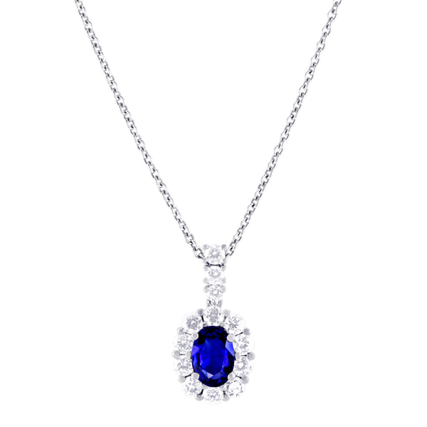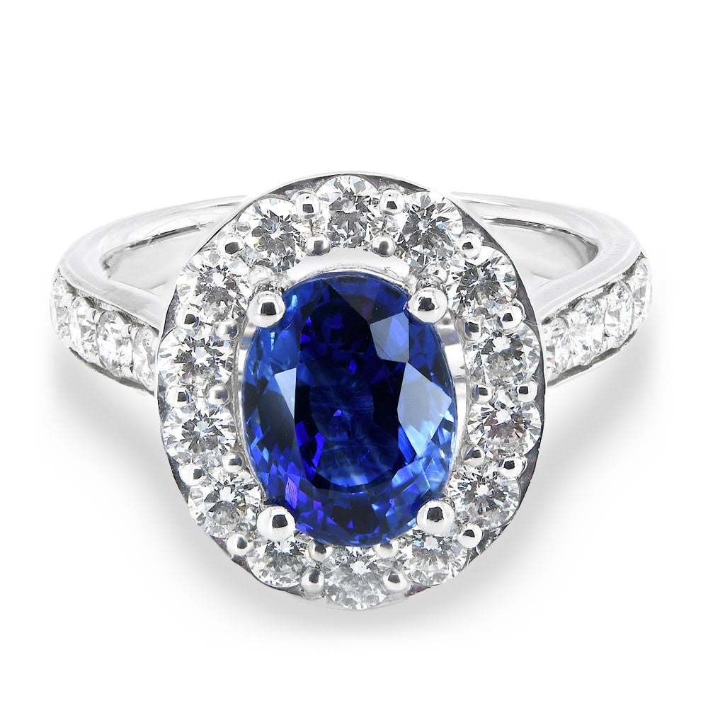 This beautiful ring is expertly crafted in platinum. The impressive central oval cut 2.52ct blue sapphire is perfectly framed by a dazzling halo of round brilliant cut diamonds, diamond set shoulders and a hidden diamond bridge totalling 1.24ct.