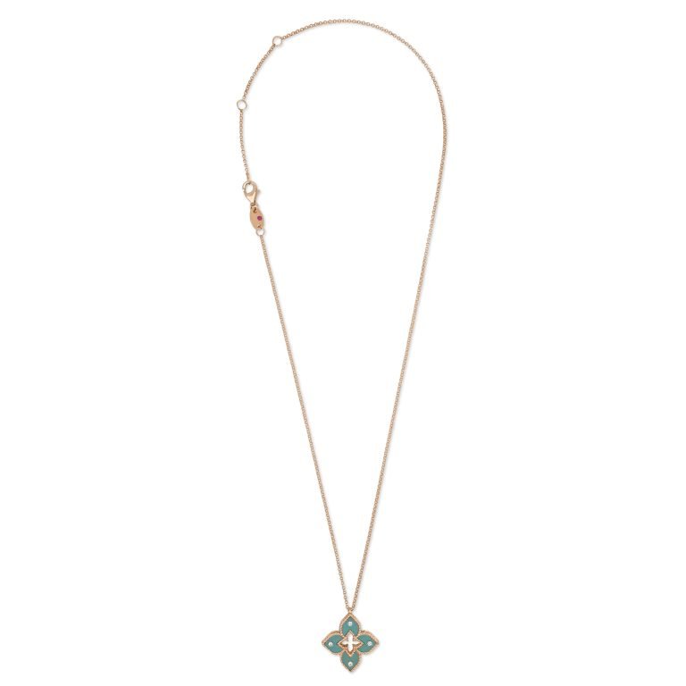 This gorgeous Roberto Coin necklace is beautifully crafted in 18ct rose gold and titanium, and is part of the Venetian Princess collection. The centre pendant is a beautiful green shade of titanium with high polished rose gold roped edging and diamonds set into the pendant. To add detail, hidden away is a trademark Roberto Coin vibrant ruby.