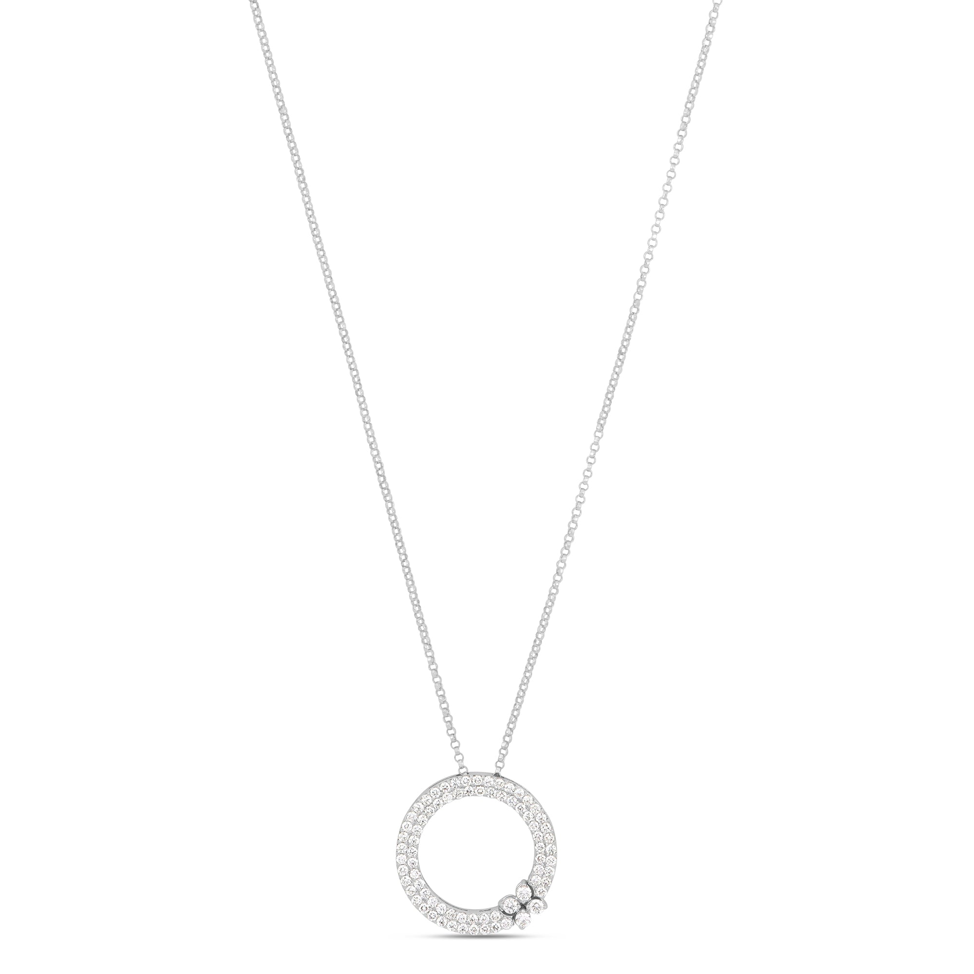 This stunning necklace is exquisitely hand-crafted in beautiful 18ct white gold and is embellished with dazzling hand-set round brilliant cut diamonds to add a touch of sparkle. To add extra detail, hidden away is a beautiful trademark Roberto Coin vibrant ruby.
