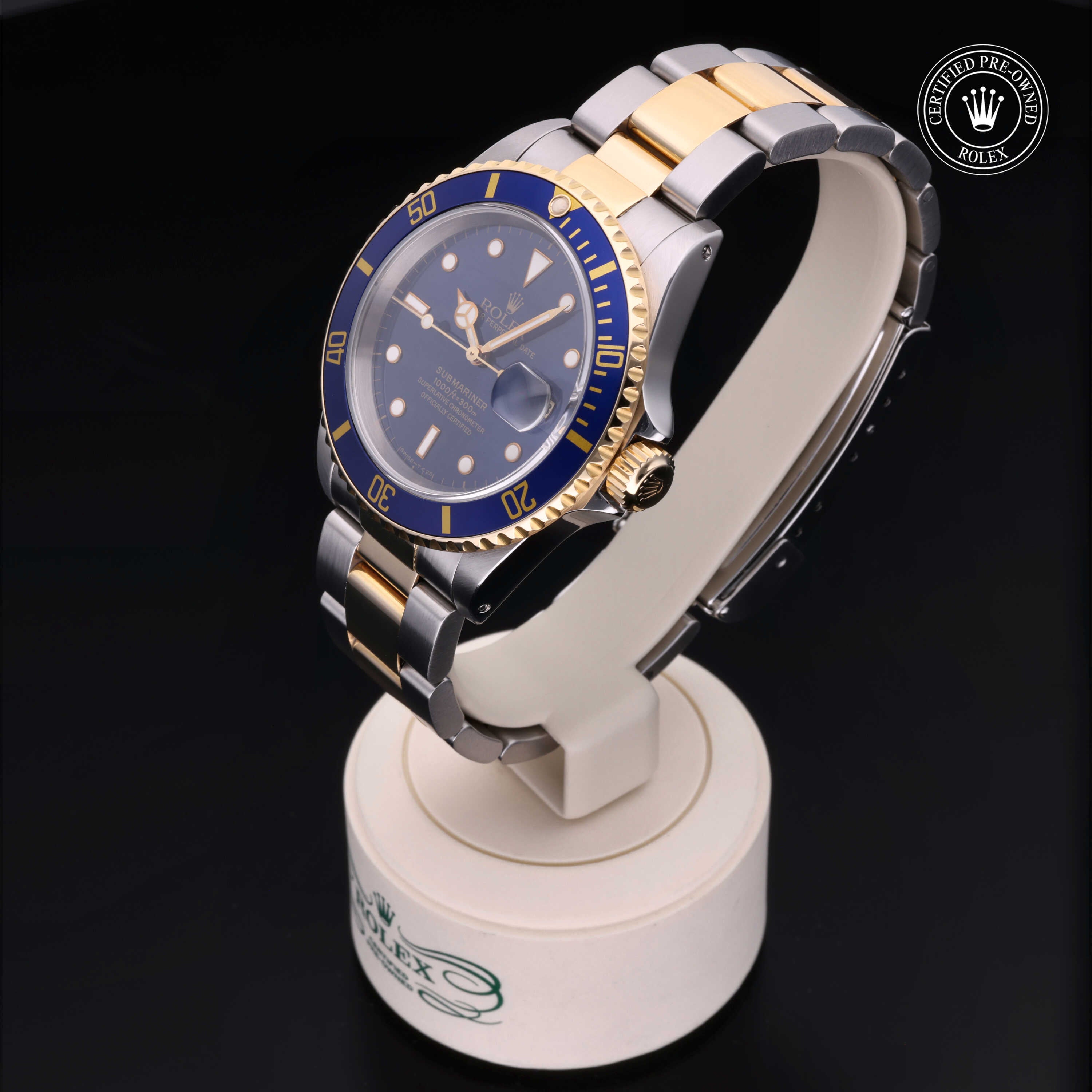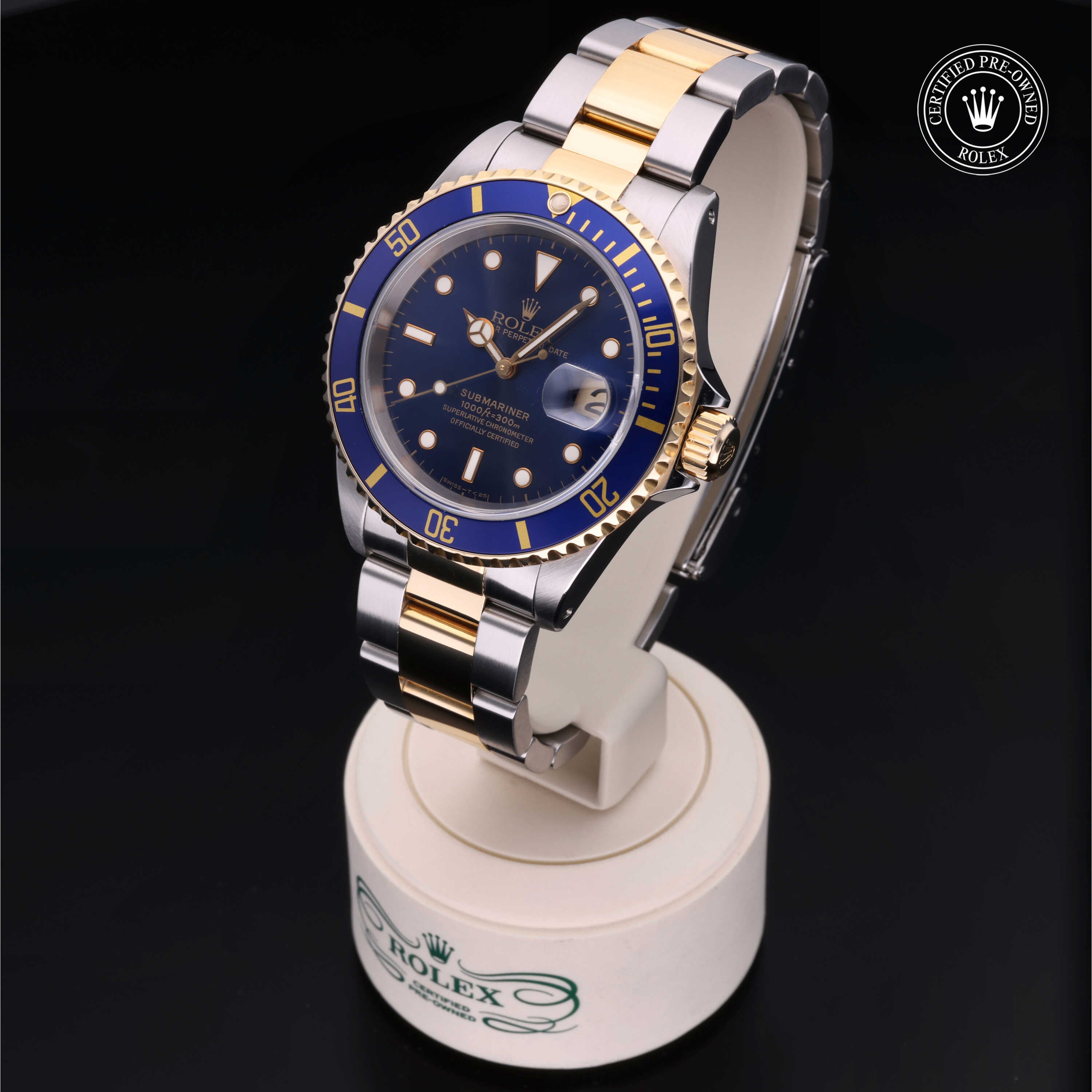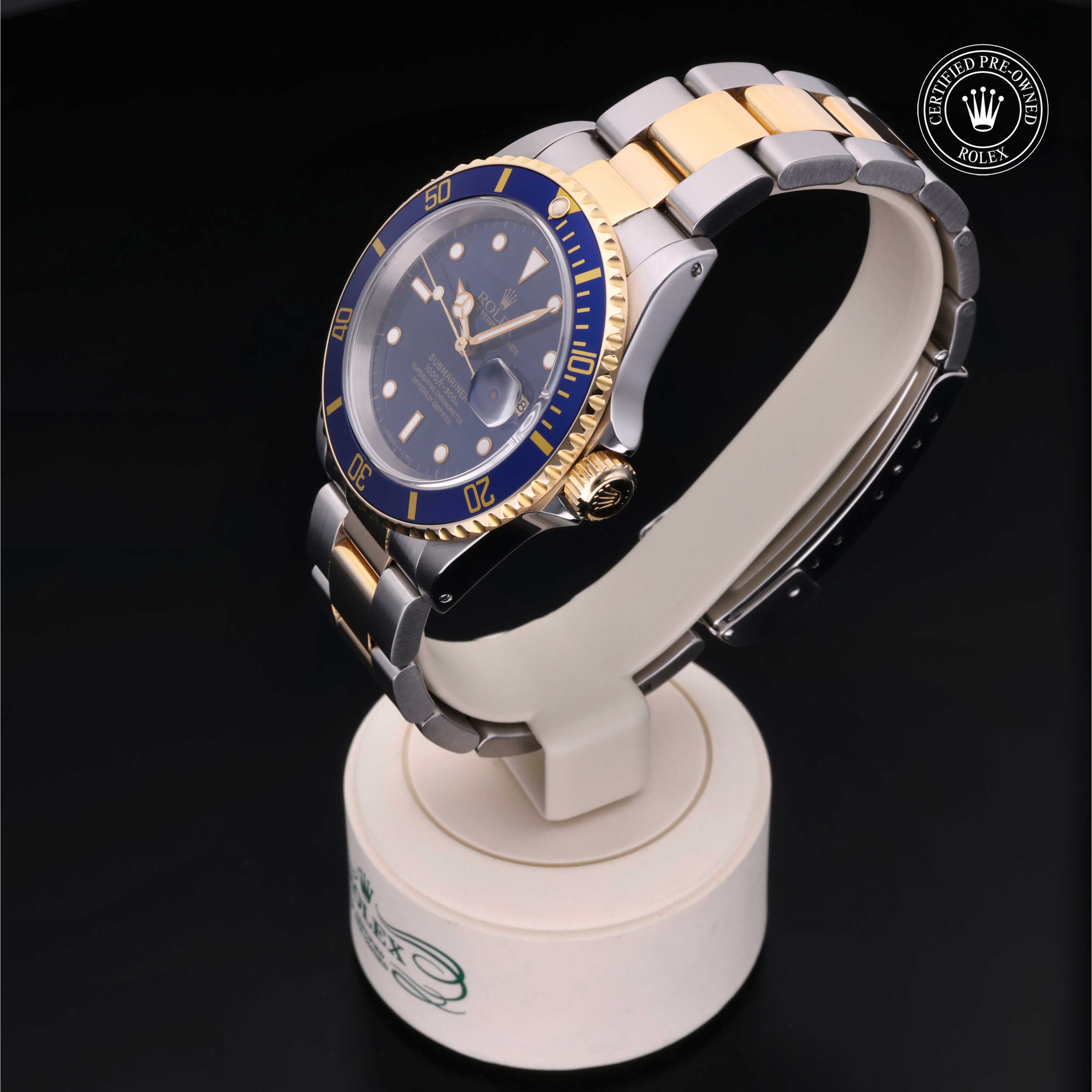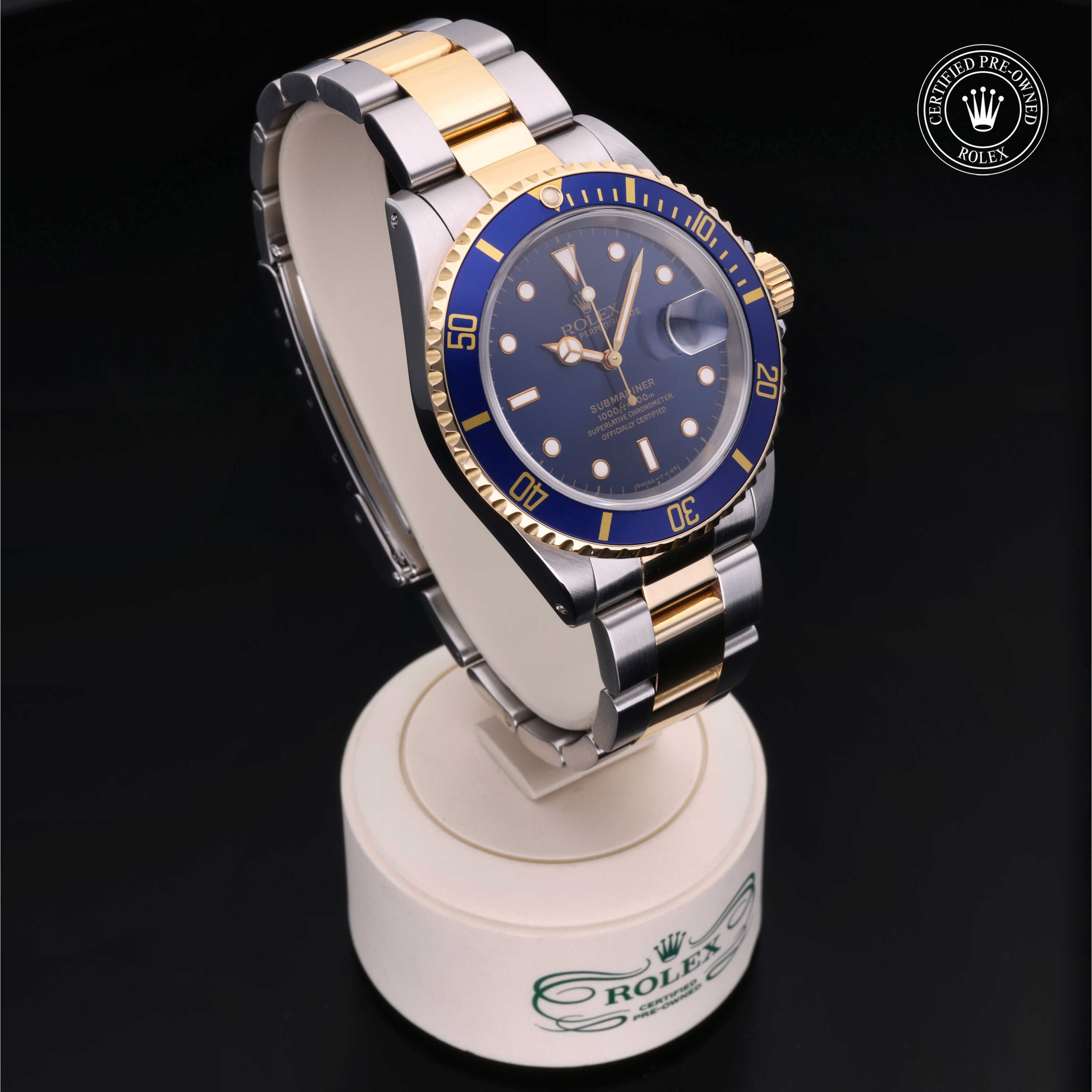 Certified pre-owned 1997 Rolex Submariner ref. 16613 with a 40mm Oystersteel and 18ct yellow gold case, blue dial with gold accents, and Oyster bracelet. Powered by the legendary Calibre 3135, it’s a perfect mix of luxury, durability, and iconic Rolex style.