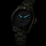 A quartz watch features a mother-of-pearl dial and a steel bracelet with a 60-minute scale, unidirectional turning bezel, and a screw-down crown, all plated in 18ct 2N gold. Eleven indexes are accented with 0.11ct of diamonds for added shimmer.