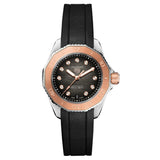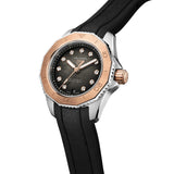 This superior TAG Heuer Aquaracer radiates elegance through its 18K 5N solid rose gold and 0.107 ct sparkling VS 1.4mm-diametre diamonds. The smokey-black dial and coordinating resilient rubber strap make it the ideal accessory for any adventure.