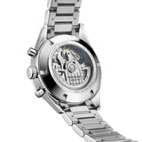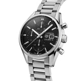 This exquisite 41mm TAG Heuer Carrera chronograph boasts a black dial and a rhodium-plated steel bracelet. Supporting it is the powerful Calibre 16 automatic movement, which lends it a bold, sophisticated, and masculine flair.