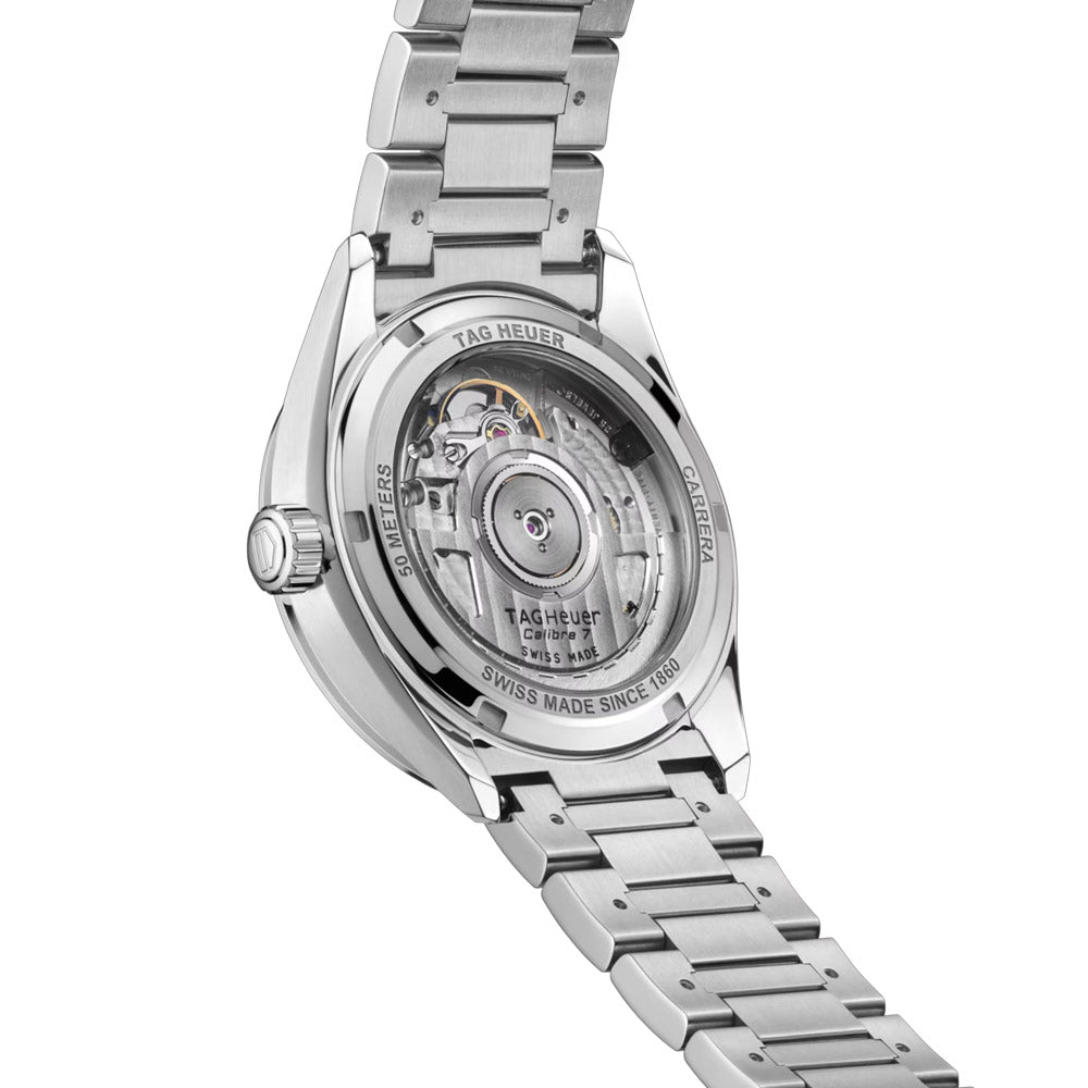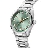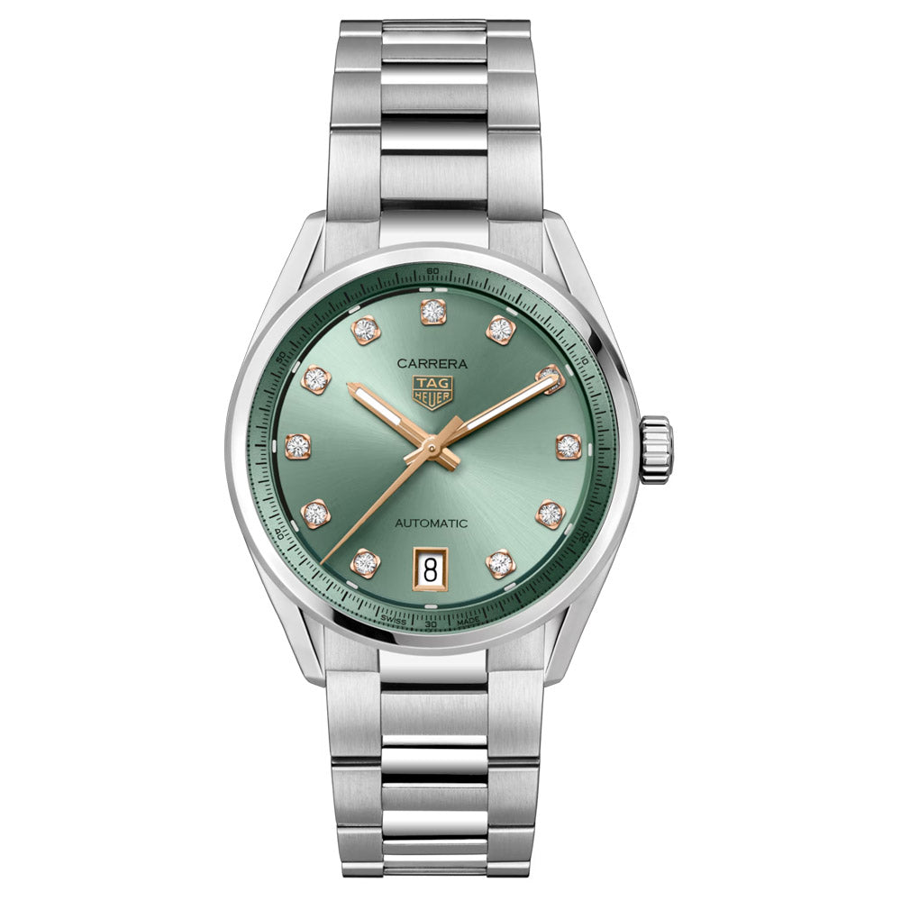 Introducing the 36mm TAG Heuer Carrera Date with a green sunray-brushed dial encased in steel. This sophisticated timepiece features a subdued pastel-like green dial adorned with 11 VS diamonds totaling 0.22 ct. Rose gold-plated accents add a refined touch to the overall design.