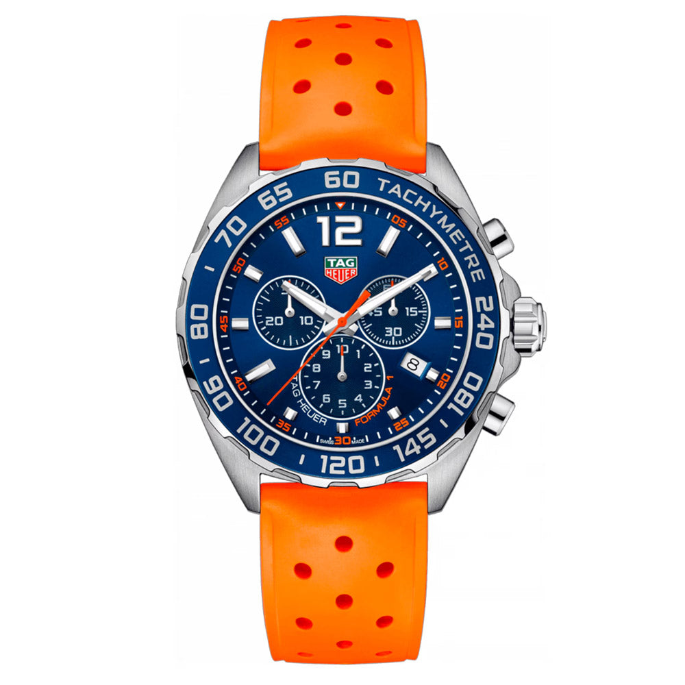This 43mm TAG Heuer Formula 1 chronograph boasts a blue dial and tachymeter scale, drawing inspiration from the most prestigious motor-sports circuit in the world. It features high-resistance materials, including scratch-proof sapphire crystal and an orange rubber strap. Experience the exhilaration without worry.
