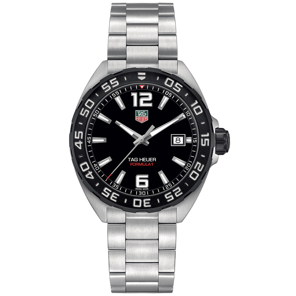Boasting a black watch face with a distinctive dial design and a unidirectional, black PVD-coated steel bezel, this 41mm brushed-steel-cased TAG Heuer Formula 1 watch is built for endurance. Its robust construction is shock-resistant and water-resistant up to 200 meters.